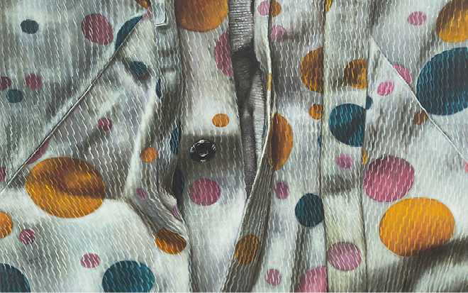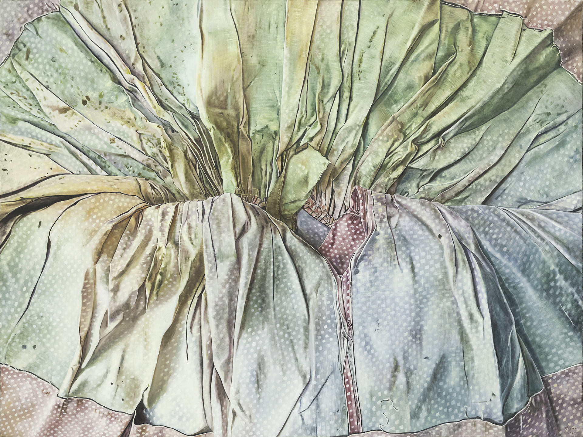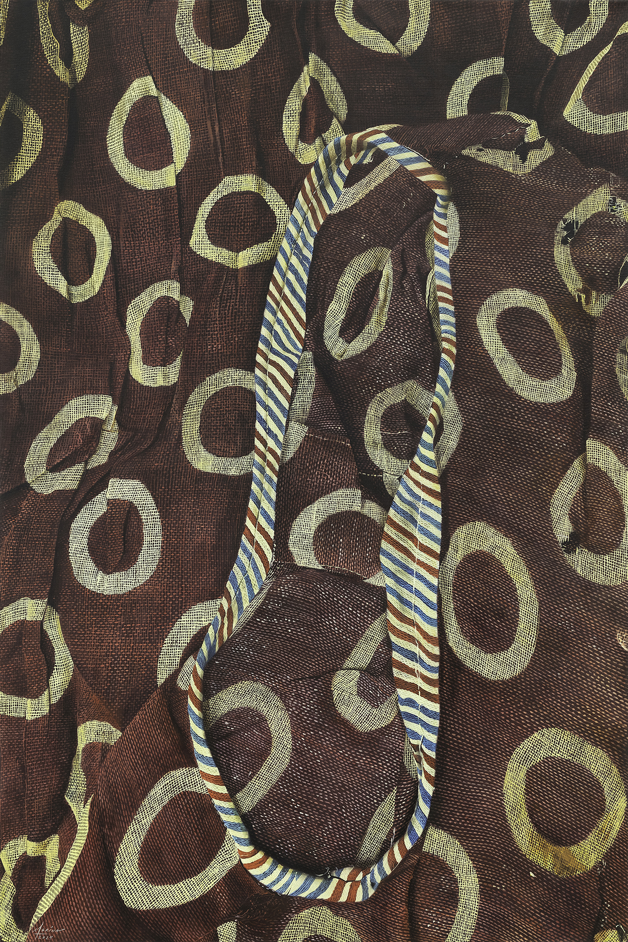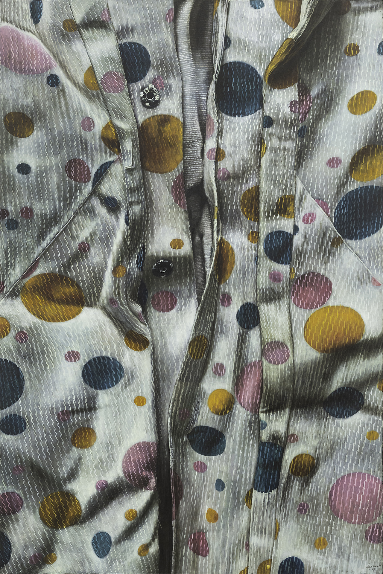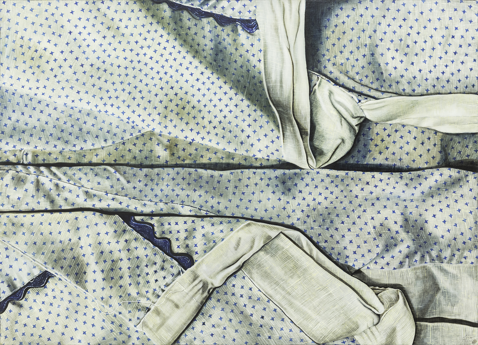 Over two decades later, Cruz remains fixated on her family’s yellowed fabrics. For her solo show Fractured Fabric, she uses the clothes to return to abstraction. As a show made of three series of works, one series does not depict pieces of clothing in their full form. Rather, Cruz focuses on their patterns, textures and minute details. A close-up painting of a dress’ armhole centers the tension of circles and pinstripes; a delicate ribbon crawls across a dark, painterly surface. The show captures the range of Cruz’s two-dimensional practice: paintings rendered in the artist’s signature photorealistic style juxtapose canvases dense with raw and loose markings.