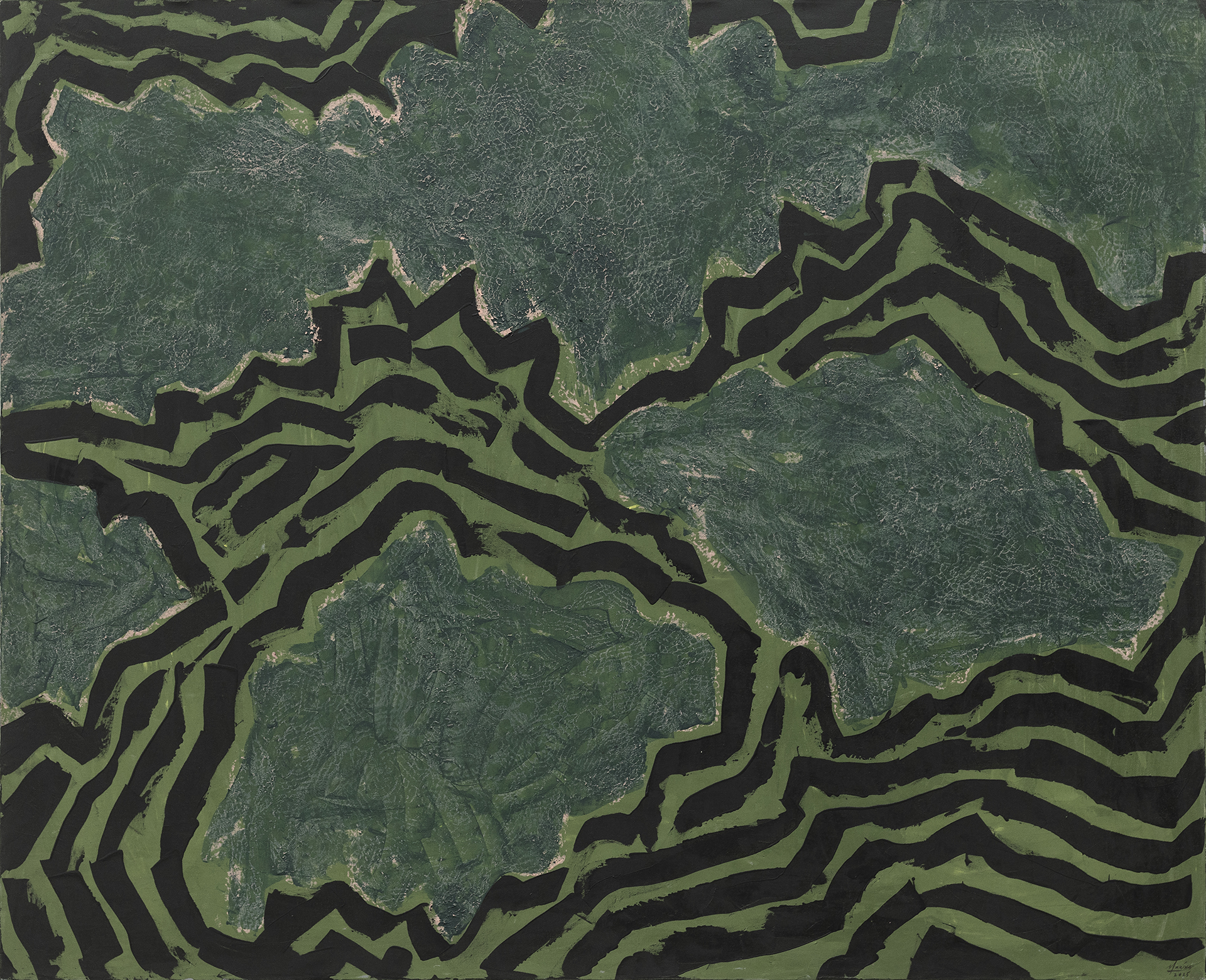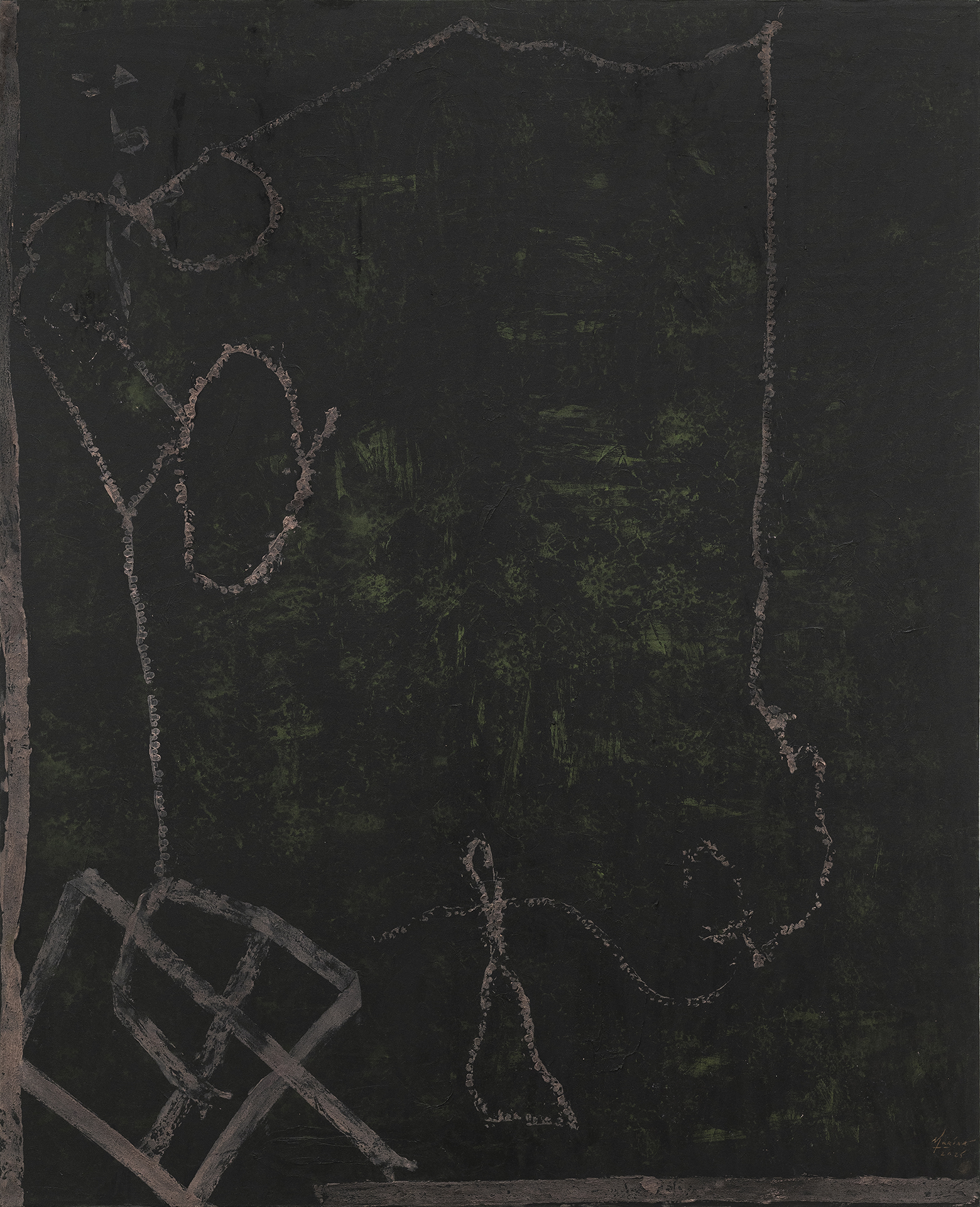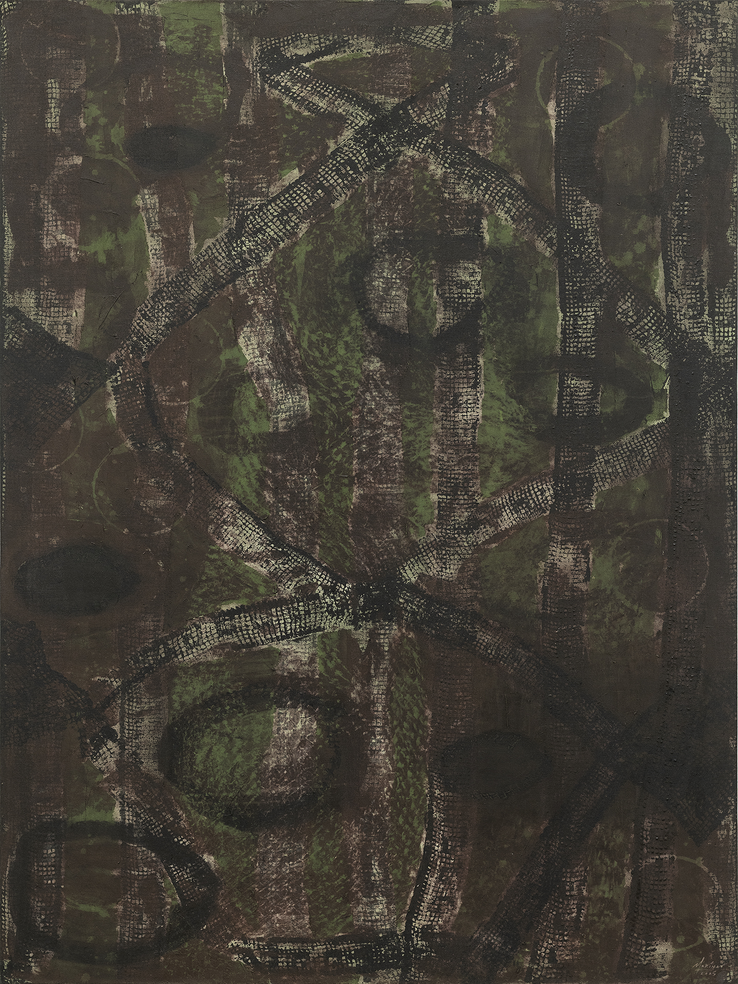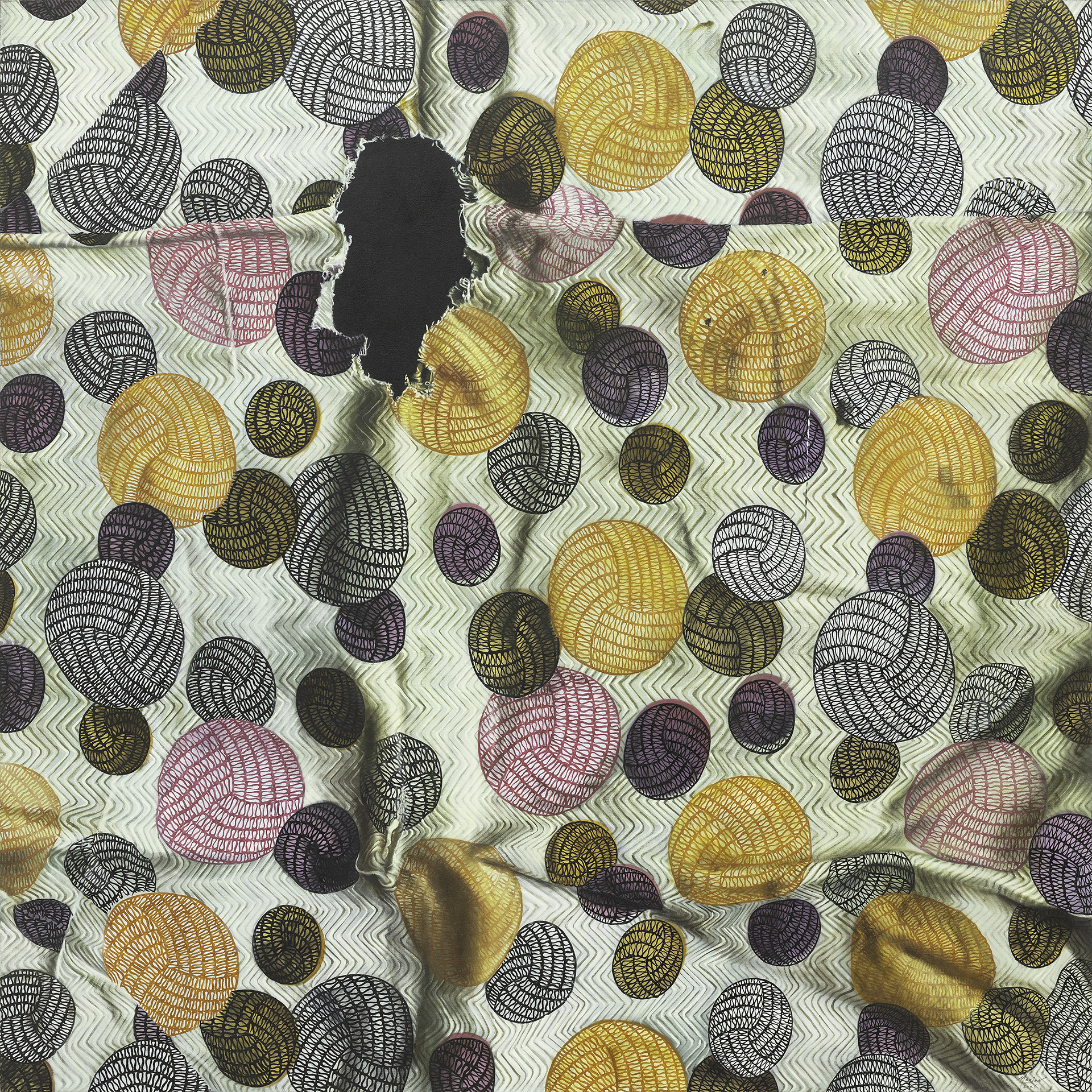 In A Veil Left by the Tides of Life, a veil floats on a sea of thick violet paint. In Veins of Bandages, a translucent cloth snakes through a plane, which is washed in dried-blood red.