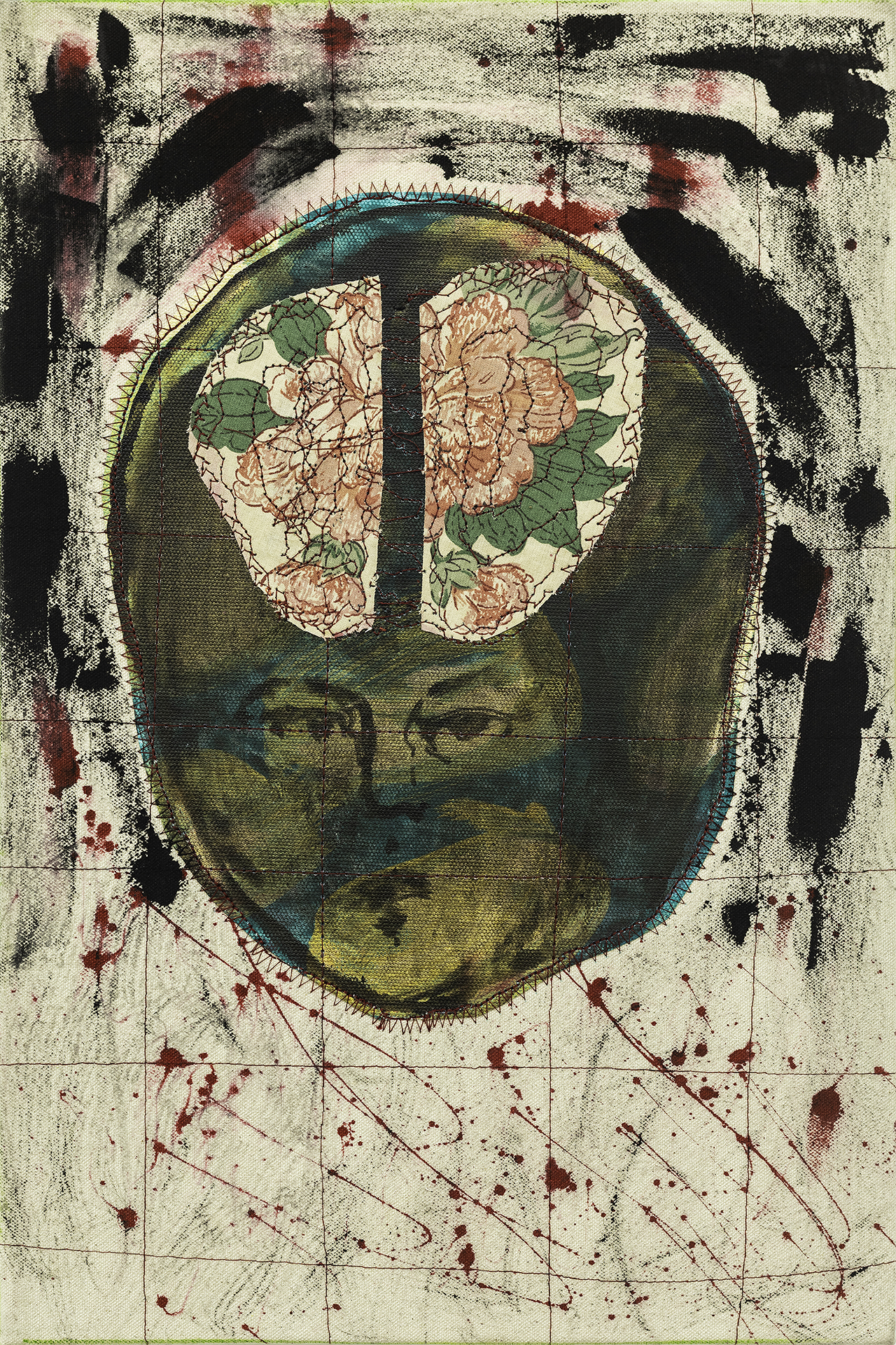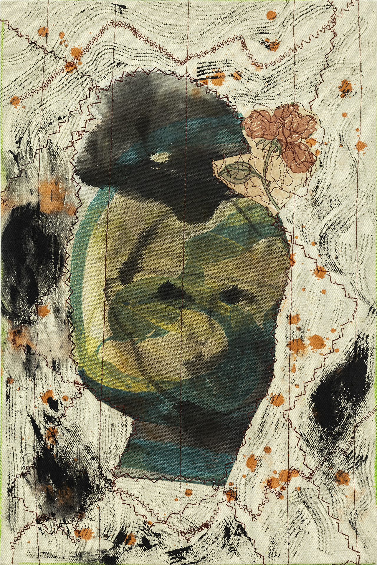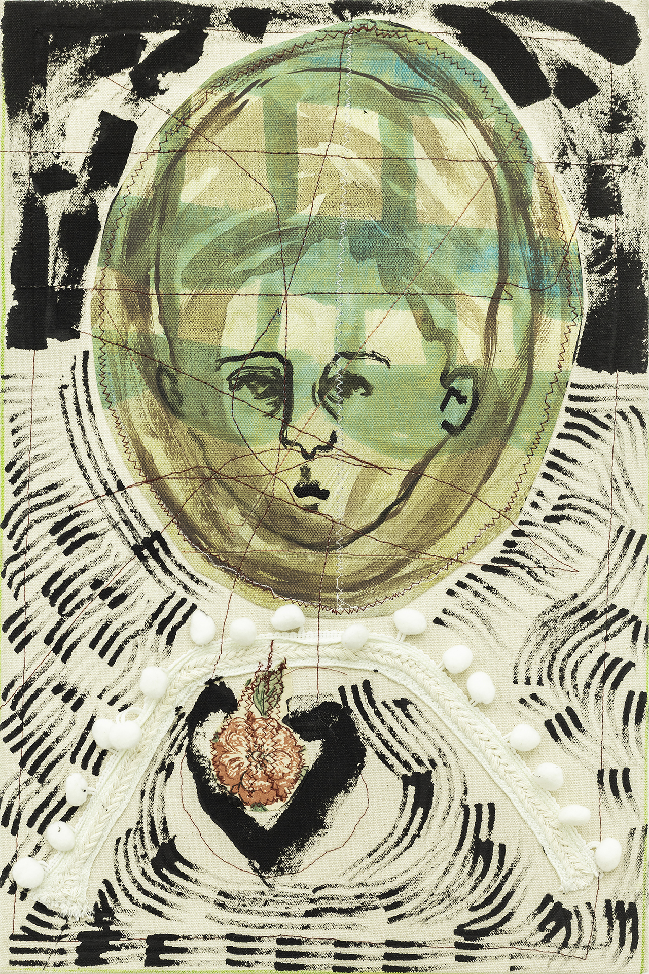 The show also offers a glimpse into Cruz’s experimental process. In a series of collages, she stitched scraps of the garments onto canvases where she left splotches, rough strokes and organic patterns. Cruz describes these works as her “warm-ups” — small canvases where she lets herself loose and musters up the motivation to create. Crude horizontal lines recur in some of the works, alluding to the pad paper that she once used in elementary school. Though the works originated from a sense of childlike play, their results are more complex. Hazy portraits emerge at the center of each canvas; according to the artist, they are not specific people. They appear like figments of dreams, their obscurity contrasting the reality of the fabric scraps. In one piece, two floral scraps and a face belong inside one dark circle, as if part of one organism.