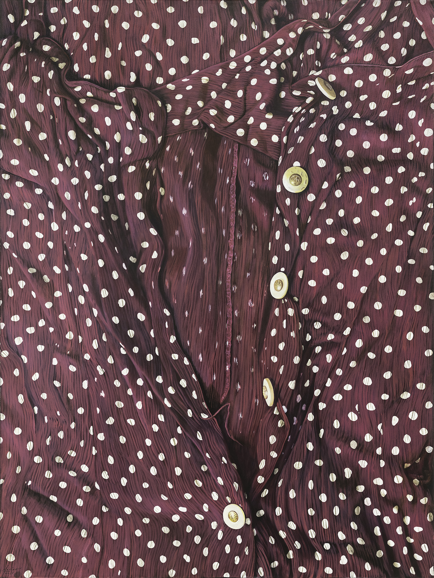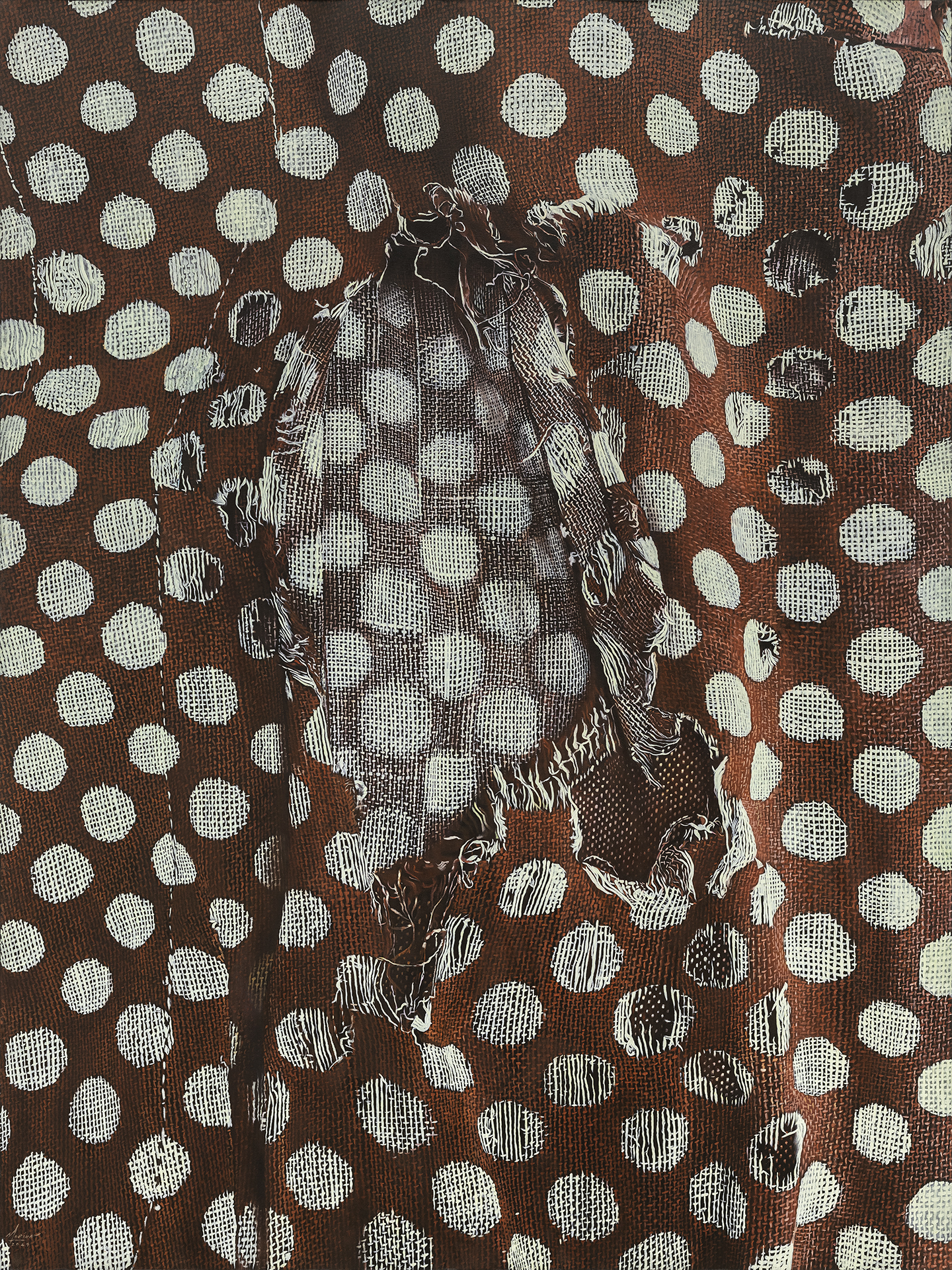 One painting in the show features a young girl’s red dress, suspended in a stark black field. It is one of only two paintings in the show that captures a piece of clothing in its entirety. The dress is filled with white polka dots — a pattern that repeats among the other weathered clothes in the show, echoing a faded innocence. The painting, entitled Tender, feels fragile, almost painful. The dress’ holes and loose threads remind viewers of the bodies that once ran and played in these clothes, perhaps learning how it felt to fall and wound themselves.