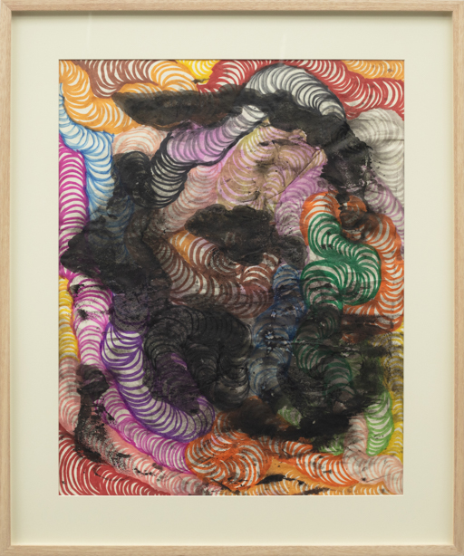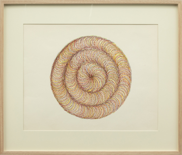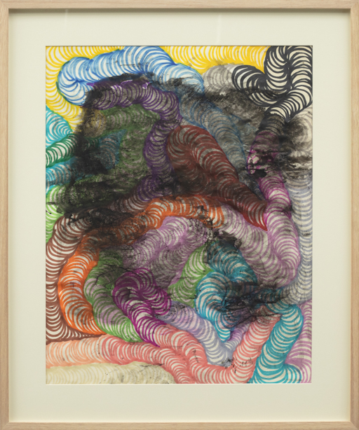 Meanwhile, Villa’s most recognizable motif, the coiling “slinky” form, appears throughout the drawings in looping technicolor lines. What first looks like a simple spiral becomes a charged ribbon of energy, ancestry, and motion. The form rolls through nearly every of his major works of the 1970s, his most iconic decade. It shows up in his seminal Tat2 self-portraits, his ceremonial capes, and his mixed-media paintings as a personal glyph. In the ballpoint drawings and rare centripetal compositions, the line tightens, graphic and precise, unexpectedly echoing Valledor’s discipline.