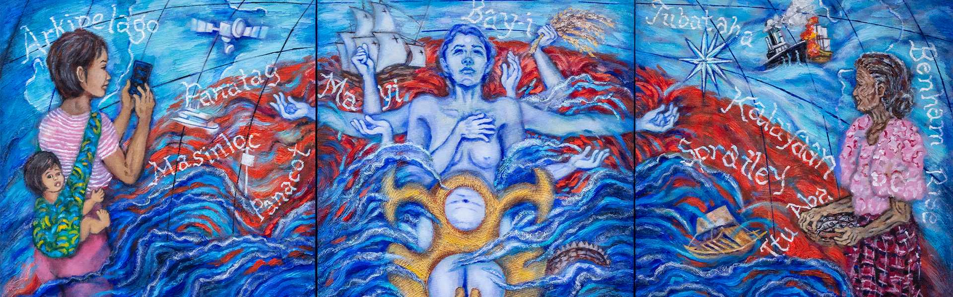 Kahapon Muli Bukas situates Filipina DH alongside Endaya’s more recent mixed media works, which tackle issues ranging from the struggle against religious oppression to the catastrophic effects of climate change in the Philippines. Here, women across the country’s vast history take center stage: a precolonial priestess, a transwoman, a grandmother. Endaya refuses their erasure from grand narratives. These women act. They labor. They fight. They guide. They exorcise. They heal. They hope. The migrant domestic workers of Filipina DH stand on the shoulders of these women. Collapsing centuries in one space, Endaya moves us to close the distance between ourselves and the neglected Filipino women of yesterday, today, and tomorrow.