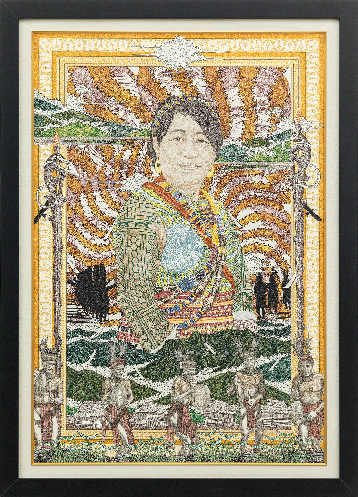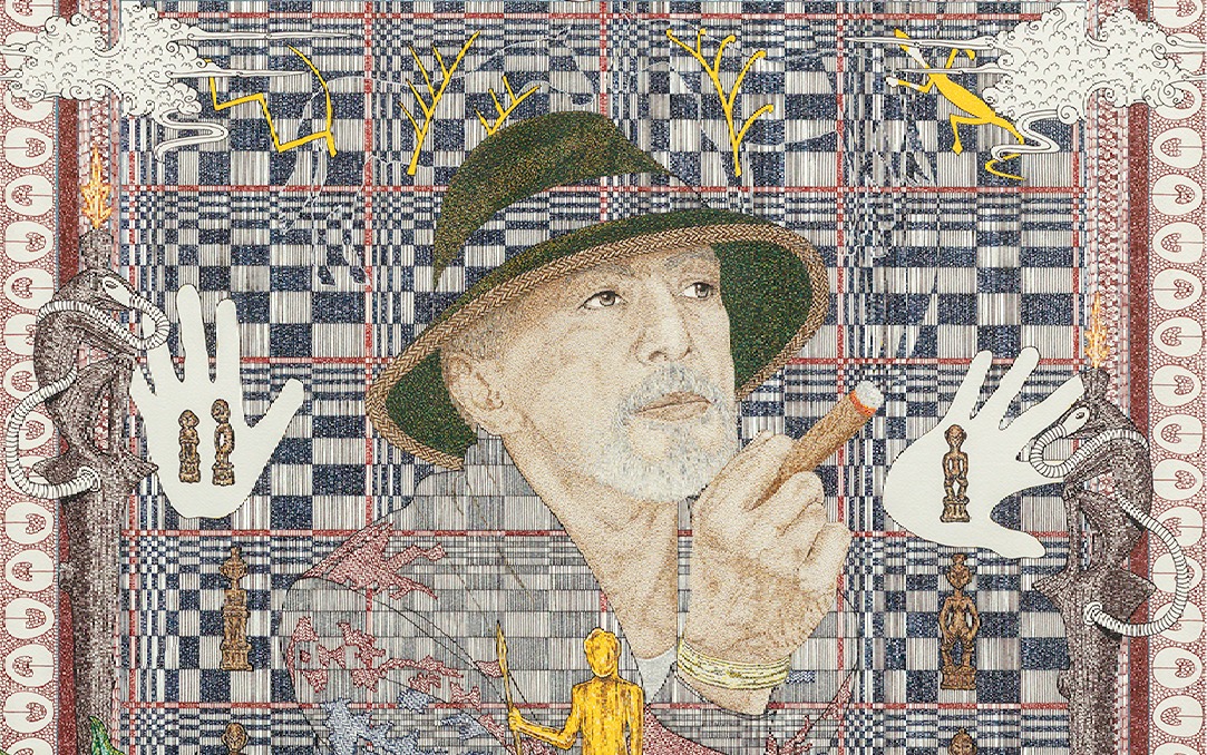 In his portraits, objects and scenes surround each of the subjects, building on the world where each operates. But the choice of elements also reveals Sabado’s learnings. He speaks of an artist who has introduced him to the medium of pen and ink, two Kalinga women leaders who have devoted their lives to sustaining Indigenous traditions, a mambunong who is a master in the Madmad ritual of the Ibaloi, an Indigenous impressionist artist who has for decades faithfully painted Ibaloi lifeways, and a mumbaki who taught him about Ifugao spirituality. Coming from his experience, Sabado implores the value of culture-bearers for the community’s youth.