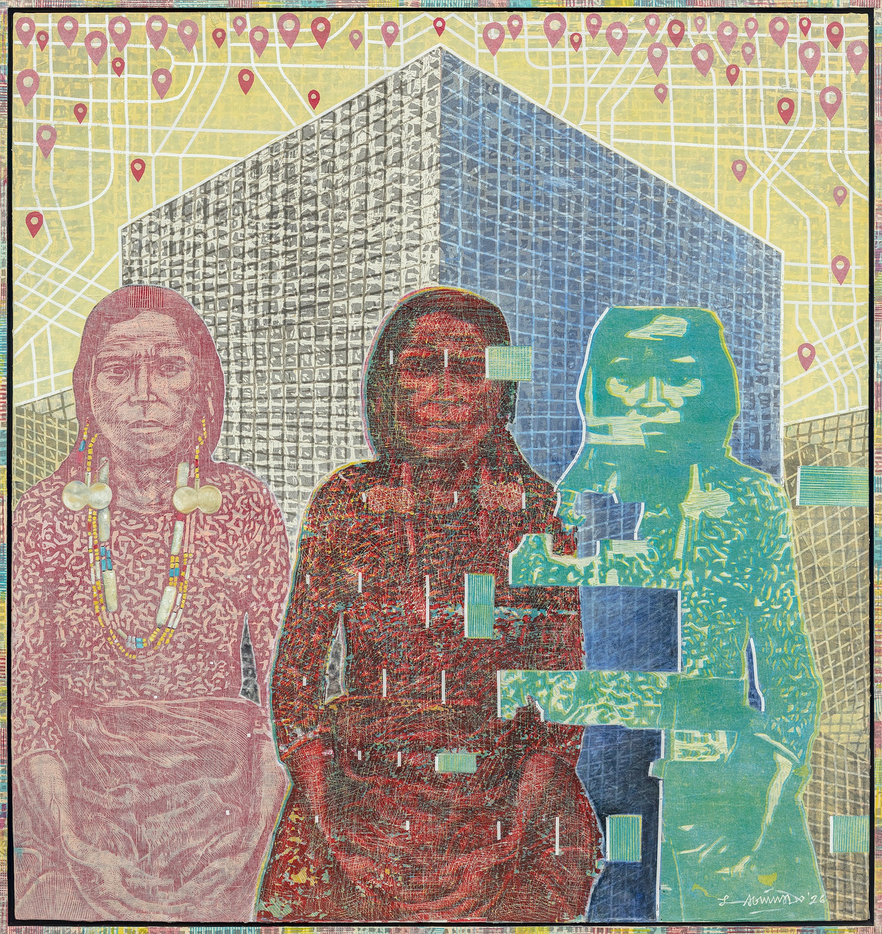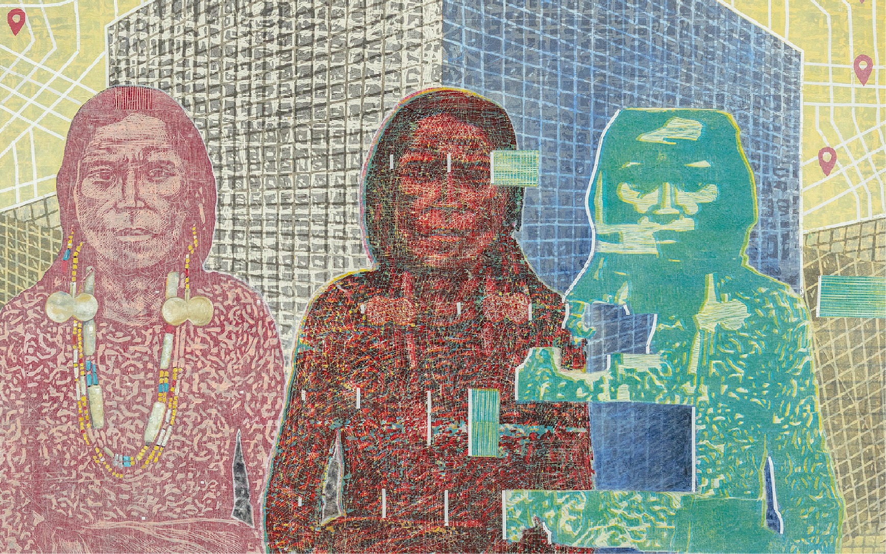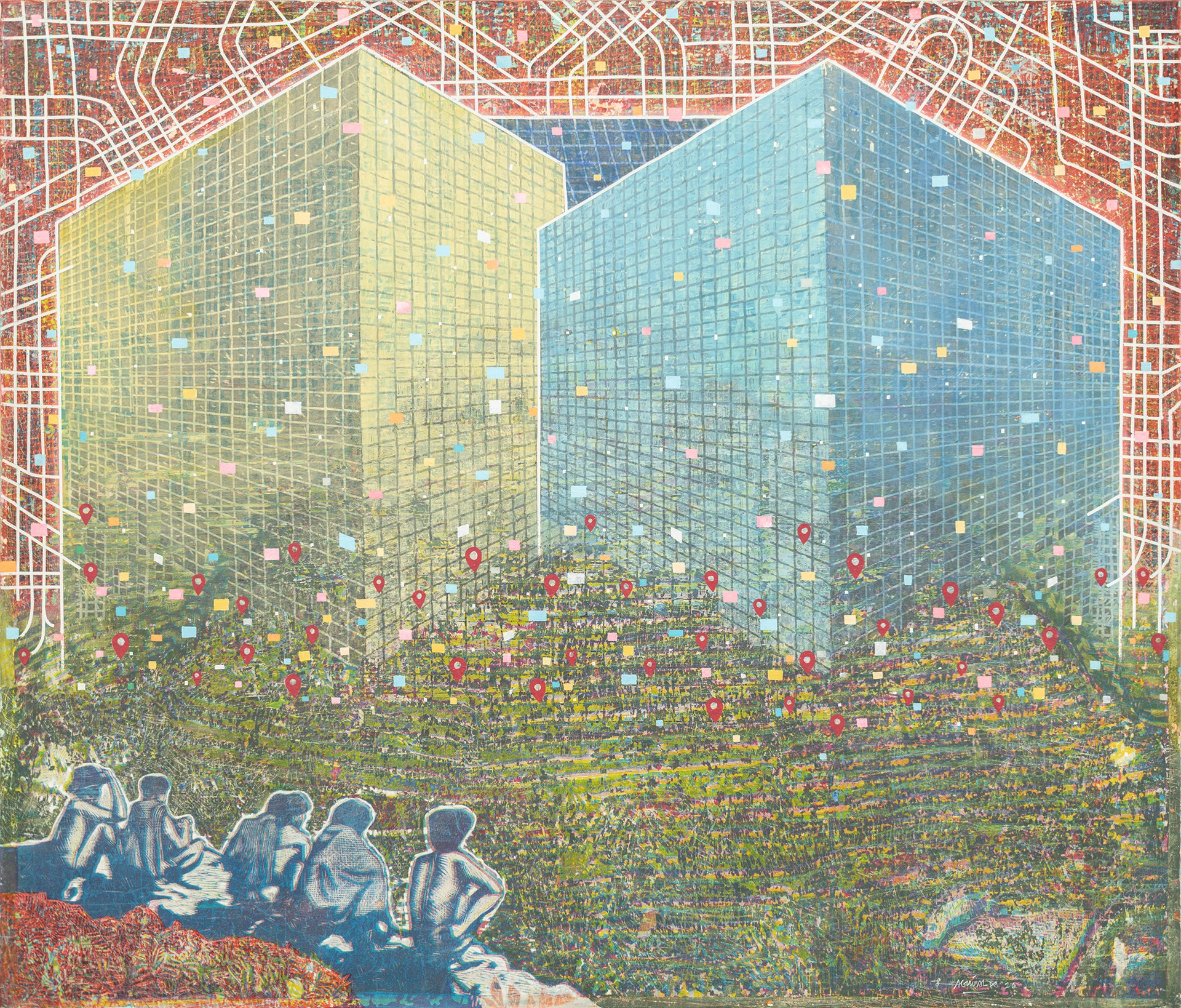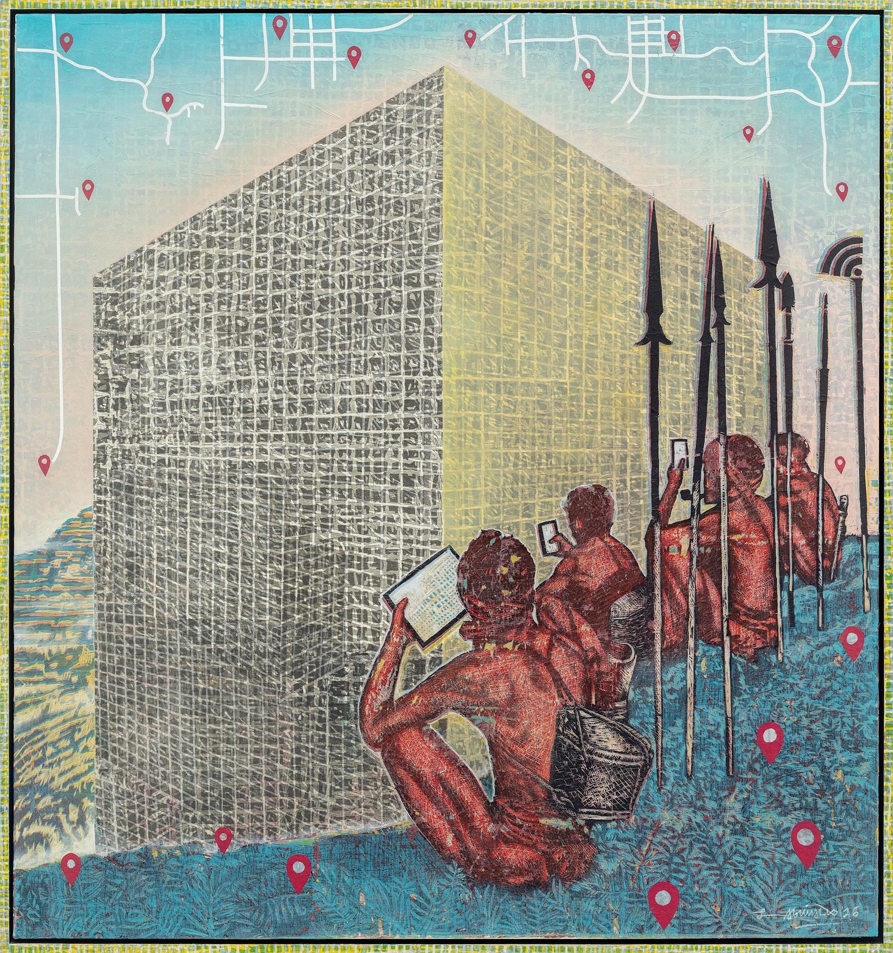 In one of his pieces, Aguinaldo references a colonial image of Igorots gazing at rice terraces. He superimposes the view of terraces with giant blocks resembling modern buildings and teeming with the iconic drop pin symbol. In another work, a local is poised atop a horse as if surveying the land. But the mountain trails are missing, and Aguinaldo paints a map of a city. The artist connotes converting agricultural gardens into grotesque tourist theme parks, a current and popular economic choice for landed locals.