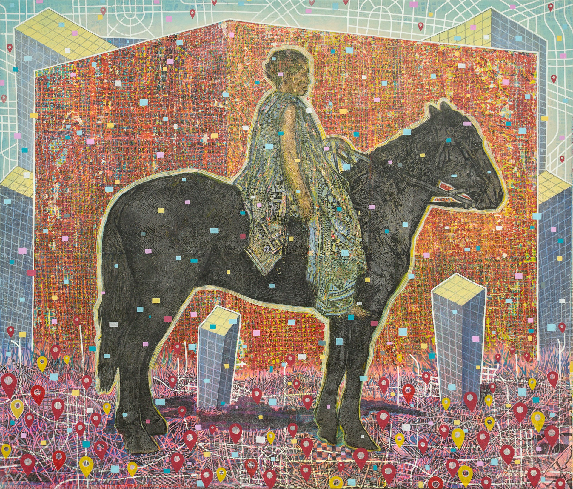 Aguinaldo, whose house sits on the side of a mountain overlooking La Trinidad Valley and parts of Baguio City, noticed a more-than-usual surge of construction projects during the COVID-19 pandemic. He began a series of depictions of locals riding horses overwhelmed by expansive converging grids and matrices of street maps and high-rises. While the city acquiesces to pernicious infrastructure-based economies, Aguinaldo observes and engages with local resistance from the city’s complex highland and lowland culture. Indigenous communities, other than the original native Ibaloi of metro-Baguio, and lowlanders have been moving in and out of the city in fleeting or drawn-out migrations.
