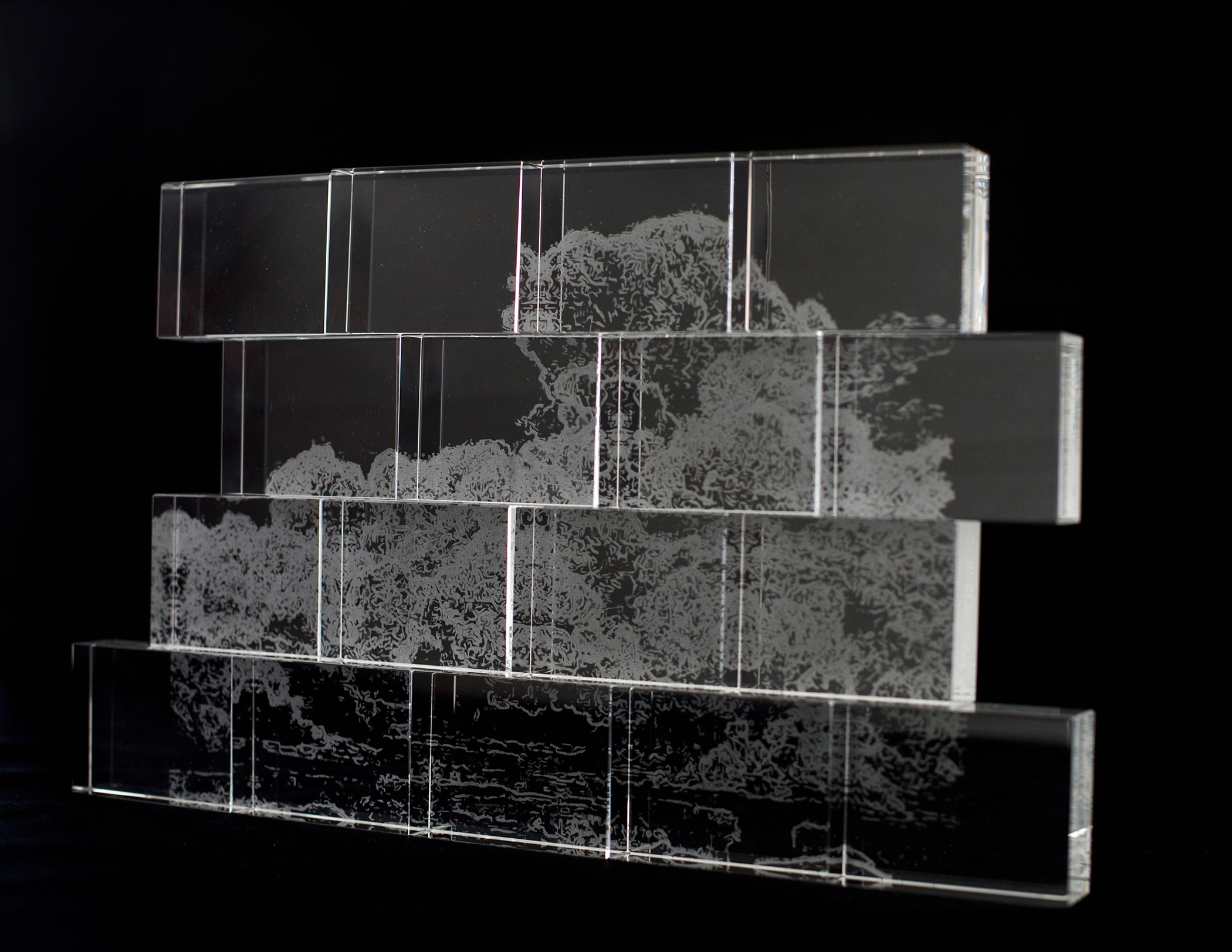 In one work, Eustaquio brings together a mirror and a photograph. The mirror is sandblasted with a collage of words gathered from the literature of Umberto Eco, Kazuo Ishiguro, Jeanette Winterson, Ali Shaw, Damien Hirst, Sylvia Plath, Gustave Flaubert, Truman Capote, Edgar Allan Poe, and Eustaquio’s 2008 sculpture “Oh”. Pieced together, Eustaquio creates a unique narrative, which she then places facing a photograph of a giant block of snow that Eustaquio chanced upon one springtime in Europe. Reflected in the mirror, therefore, is a chance encounter of this piece of ice, waiting at the side of the road for winter to come. And when the two halves meet, a second narrative emerges. In the glass and in the ice, we are reminded of how hazy or how clear memory can be. Or, how delicate or how enduring.