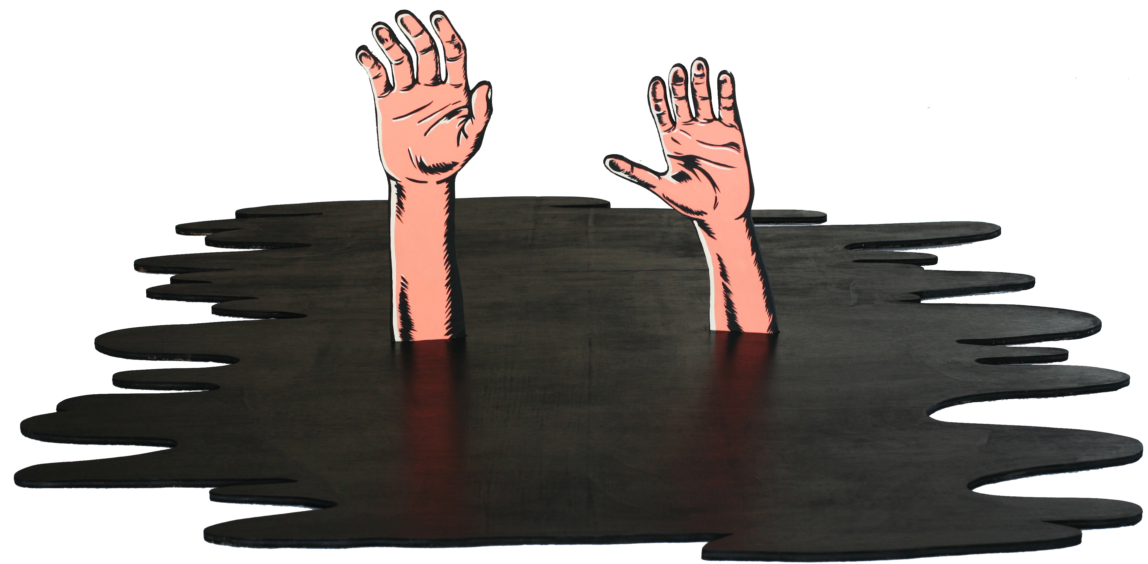 The show centers around a cut-out floor piece which takes from old hand-painted advertising standees. Cut to the shape of the image, a pair of hands is raised up from a black puddle in a motion for help, the gesture a deference to movie cliché. Entitled New Nadir: Ventures on Unchallenged Imagination, the semi-sculpture collages to the space of its exhibition. Though cut-out standees are not new for Gadia, 3D is still relatively rare in her oeuvre, reflecting possibilities of further investigations, as she continues to recycle pictures from dated mass visual culture.