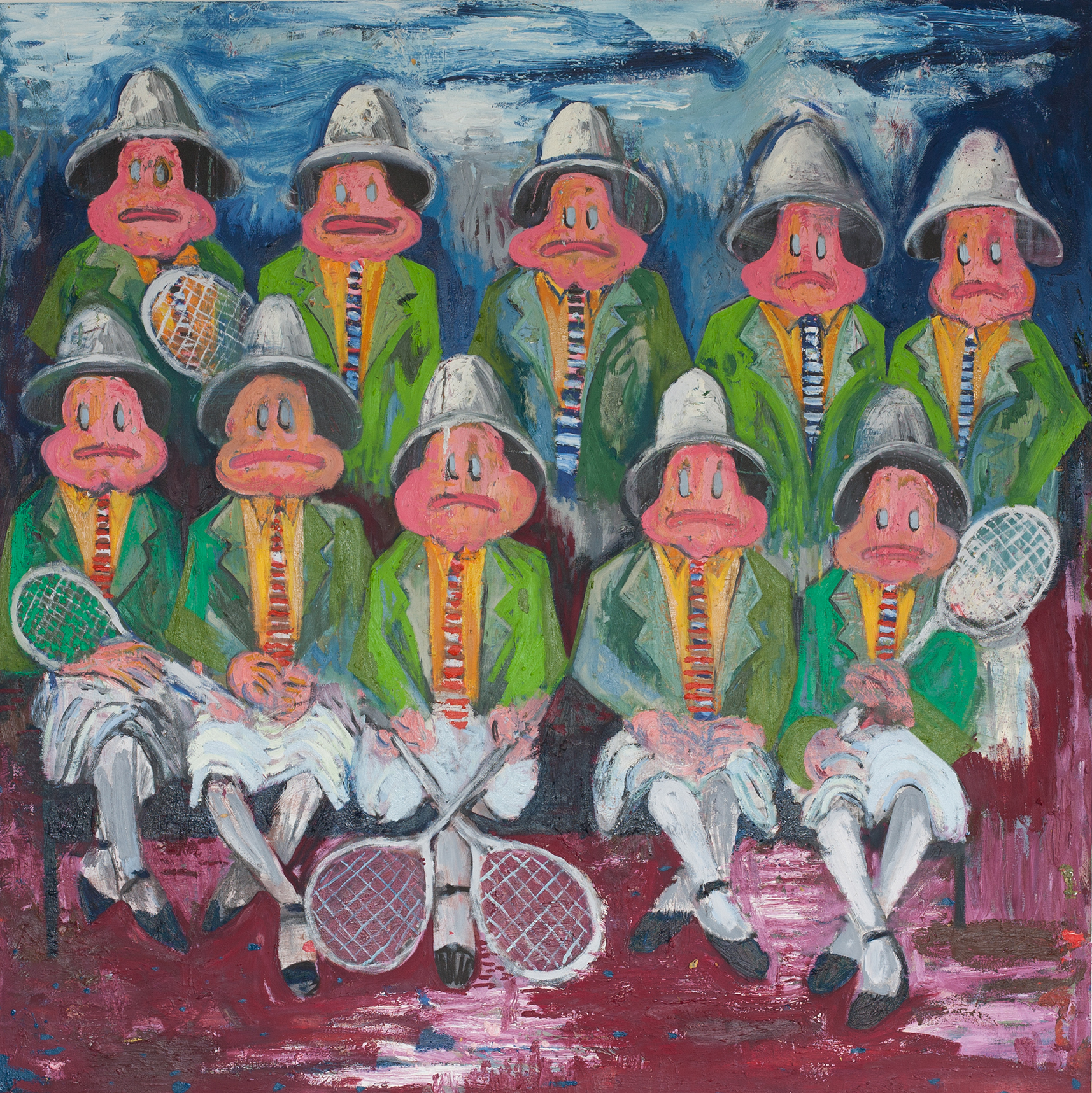 Sets of people feature strongly throughout his exhibition at Silverlens. Sports teams and various groups such as (s)expats on holiday with bikini clad ladies visually represent an interest in uniforms and the symmetries of arrangement, as well as the uncomfortable connotations of the sex industry and tribal/team mentalities. Vintage Tennis homogenizes a historical sports portrait, into a group of players with the same frog like, scowling face. Conversely Scene