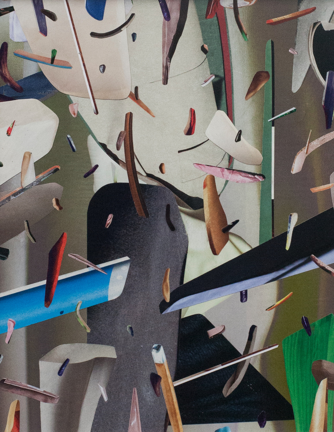7. Building. For some reason, I’ve always related more to the idea of building, that a collage is a kind of picture or model that I build, closer to an object that I craft by hand rather than a picture that one draws or paints. I cut out each element and see it more than just a shape or a silhouette; each one is an individual object, something with dimensionality, depth and weight, something that responds light, force and gravity. At certain groupings, they may resemble anything from monolithic structures to visions of futuristic or premodern cities, other times they seem to depict floating bodies that are either drifting or falling, converging or caught in mid-explosion. This visual language has slowly and steadily evolved through the years, seemingly at its own autonomous direction and pace. I may have identified the materials and cut out all the forms, but rearrangement of elements seemingly follow an imbedded logic that stays true to the narrative and persists till the end.