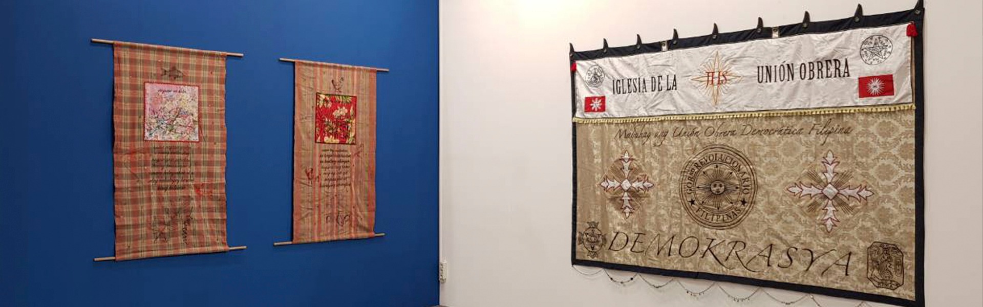 Roldan’s practice weaves the narrative of the revolution with elements of Catholicism. Taking inspiration from traditional Catholic ceremonial vestments, Roldan re-embroiders and re-embellishes contrasting symbolisms of the uprising; integrating revolutionary flags and masonic imageries with symbols of Jesus Christ and fleur-de-lis. Roldan labels the tapestries with fictional churches, such as the Iglecia de la Liga Filipina, as a nod to battle flags rallying resistance against colonial rule.