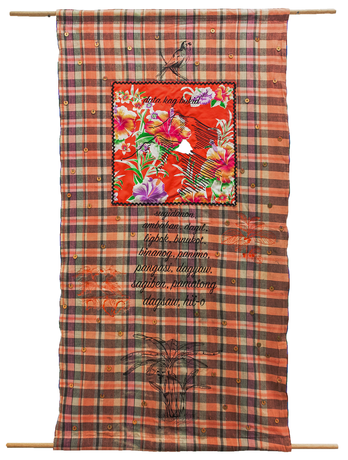 In one set of works, Roldan embroiders over patadyong, a pre-Hispanic loose skirt often worn by women of the Visayas region. Embellished on these skirts are traces of Philippine colonial and pre-colonial history; images of rosaries, native materials, and Philippine gods.
