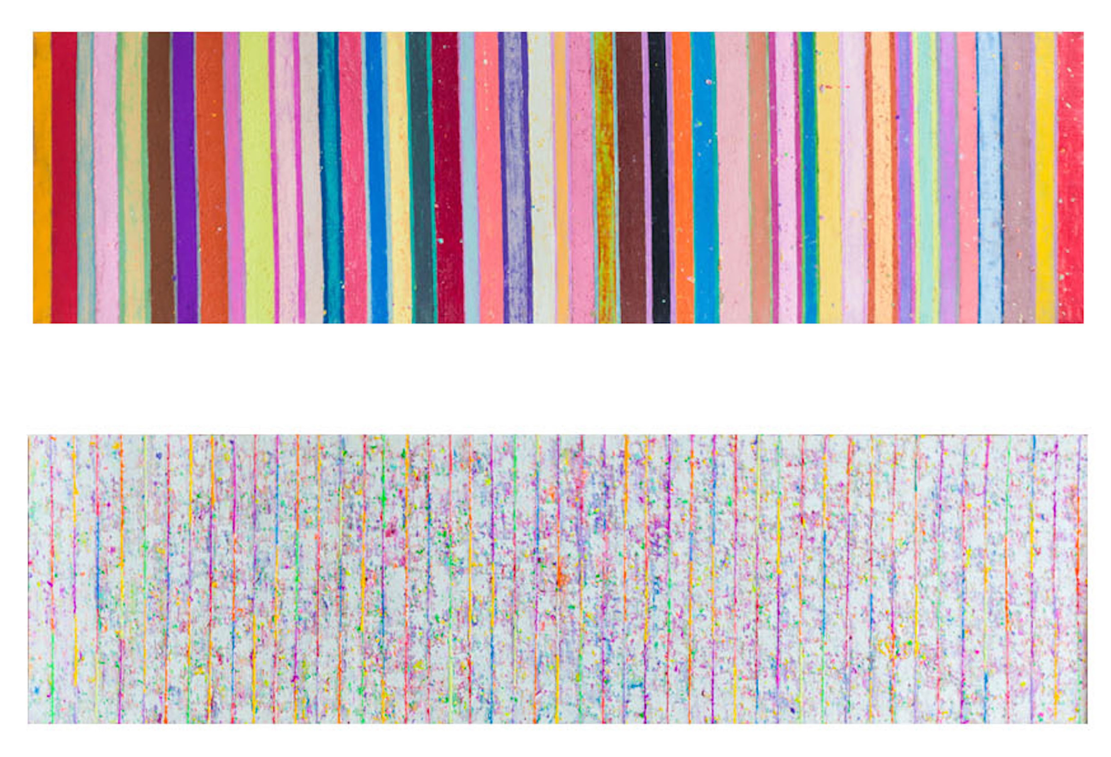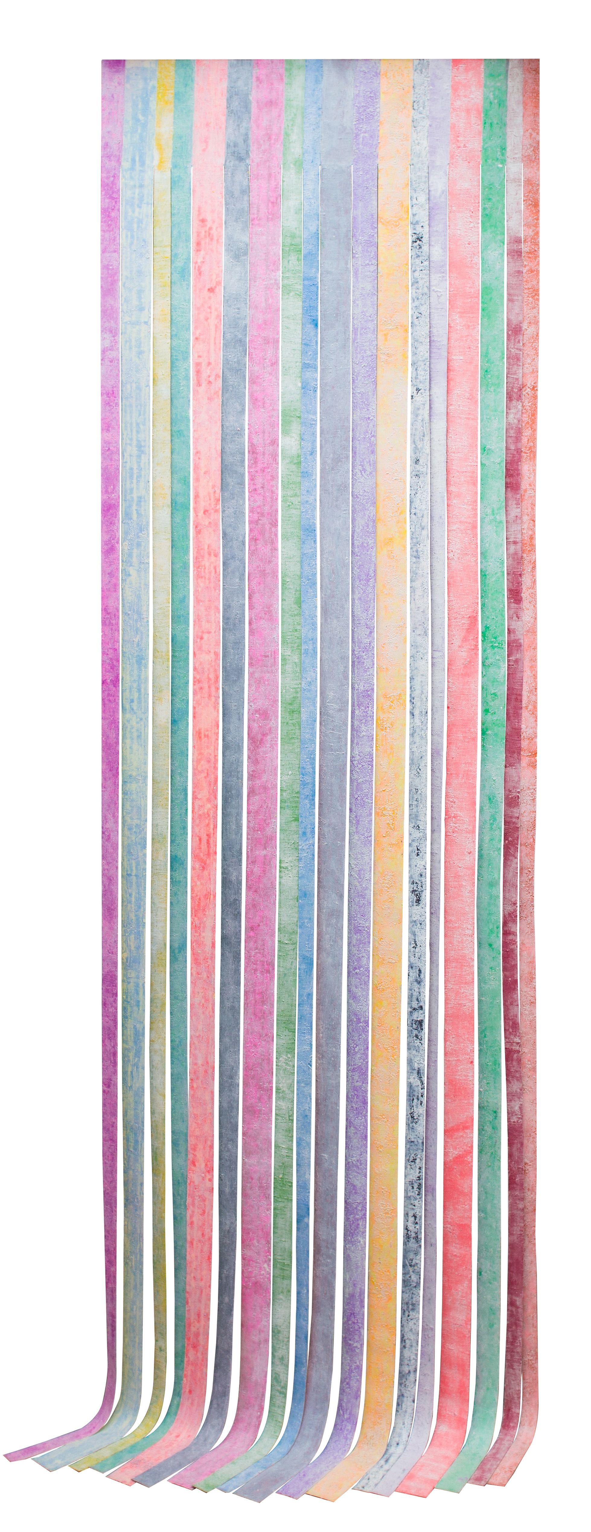 Actants convenes hundreds of ribbons in three new bodies of work. These long strips of linen, heavily layered with Mit’s signature bold colors, have been meddled with – dulled with hot wax baths, smeared and scraped by contact, textured and muted with powder.