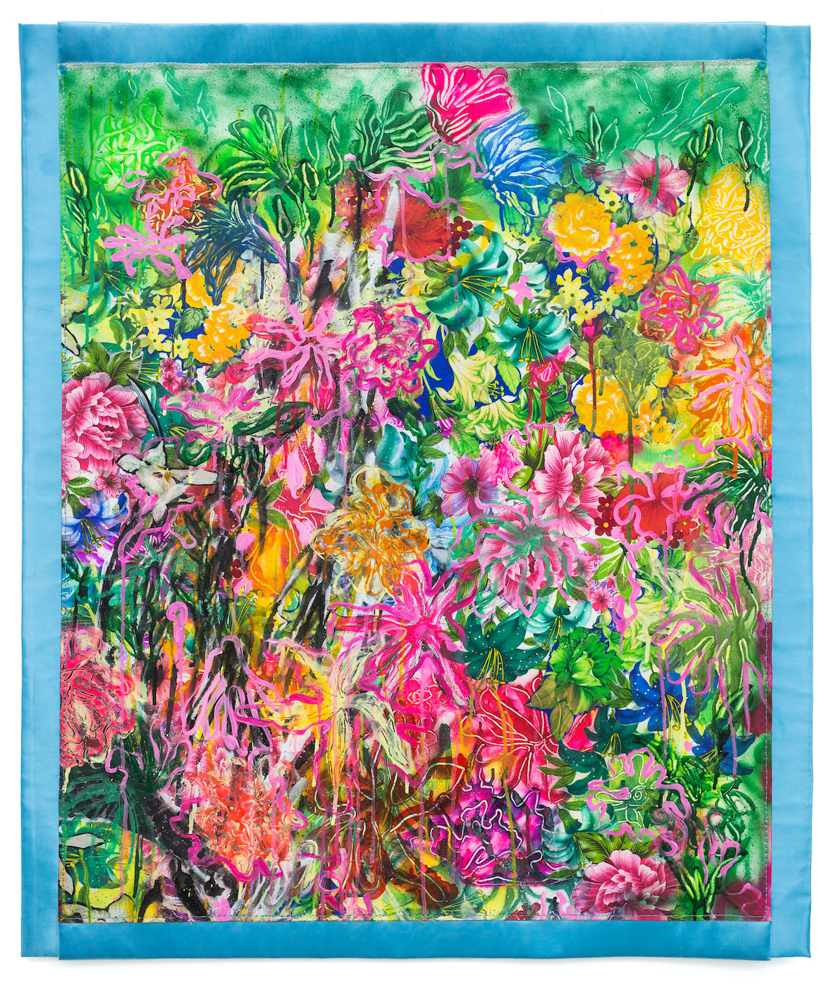 Beauty, as is often said, lies in the eye of the beholder, and to look deeper into the nature of beauty is to descend into a territory of shadows. The pieces in THE GARDEN rest somewhere in that state-- a narrow chasm of dualities: light and dark, joy and sadness, serenity and chaos. There is the quiet idle of a lazy afternoon picnic in “Everywhere There You Are” and the explosive moment in “Fugue”. There is an unpossessable feast in “August Banquet” and the dizzying chaos of “Floral Brute”. Grotesque shapes make up the “Feral Garden” in super multi toxic tropical neon, each element existing next to the other in perfect discord. They are images of illusory moments that are unresolved, strange, restless and by default can be sinister. THE GARDEN is a bold, complicated and colorful world that evokes the beautiful and grotesque co-existing side by side. It is a world of materiality and the present; transient, illusory and ever changing. It is the everyday life: banal, mundane yet somehow also magical.