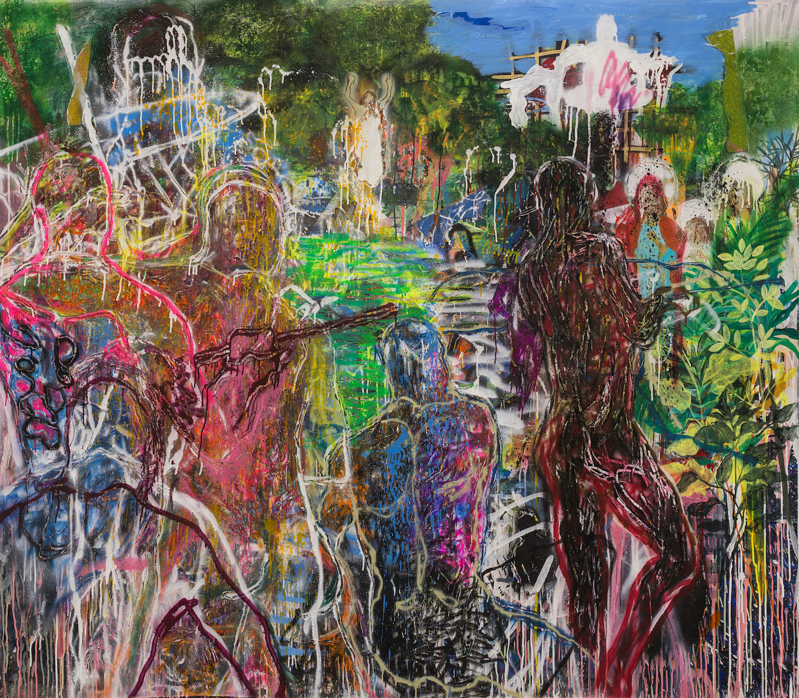 A: In one of my earlier pieces, I painted a crucified Black Nazarene on an altar setting full of plants and flowers. I wanted to re-imagine him as St. Augustine, a sinner saint. He is not really Christ but more man: definitely a sinner, definitely in need of salvation. The title to me means having too much of something that you don’t need at the time. Feral Garden can be an allusion to a letting go of or an untamed wild state of something that should have been kept maintained and somewhat curated or controlled. The phrase “meanest kisses sold in times of famine” makes no sense. I heard it said by David Berlinski as something that made no sense, yet sometimes a thing makes no sense until it does. It’s all about context.