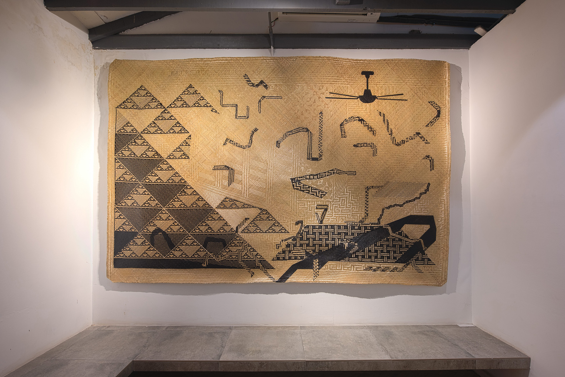 Made in collaboration with sea-based Sabahan, Malaysian weavers, Yee I-Lann’s TIKAR/EMOJI/PLASTIK mats incorporate plastic waste collected from the beaches of Omadal Island and Kampung Kolopis in Sabah to depict a whirling, polychromatic array of emojis against a backdrop of heritage weave motifs. For Yee, emojis provide a shared language that requires no unpacking or translation, coming as close as we have to a universal tongue. Simultaneously, by using plastic litter to create the icons, the artist calls attention to the plastic waste emergency suffocating global seas and landfills.