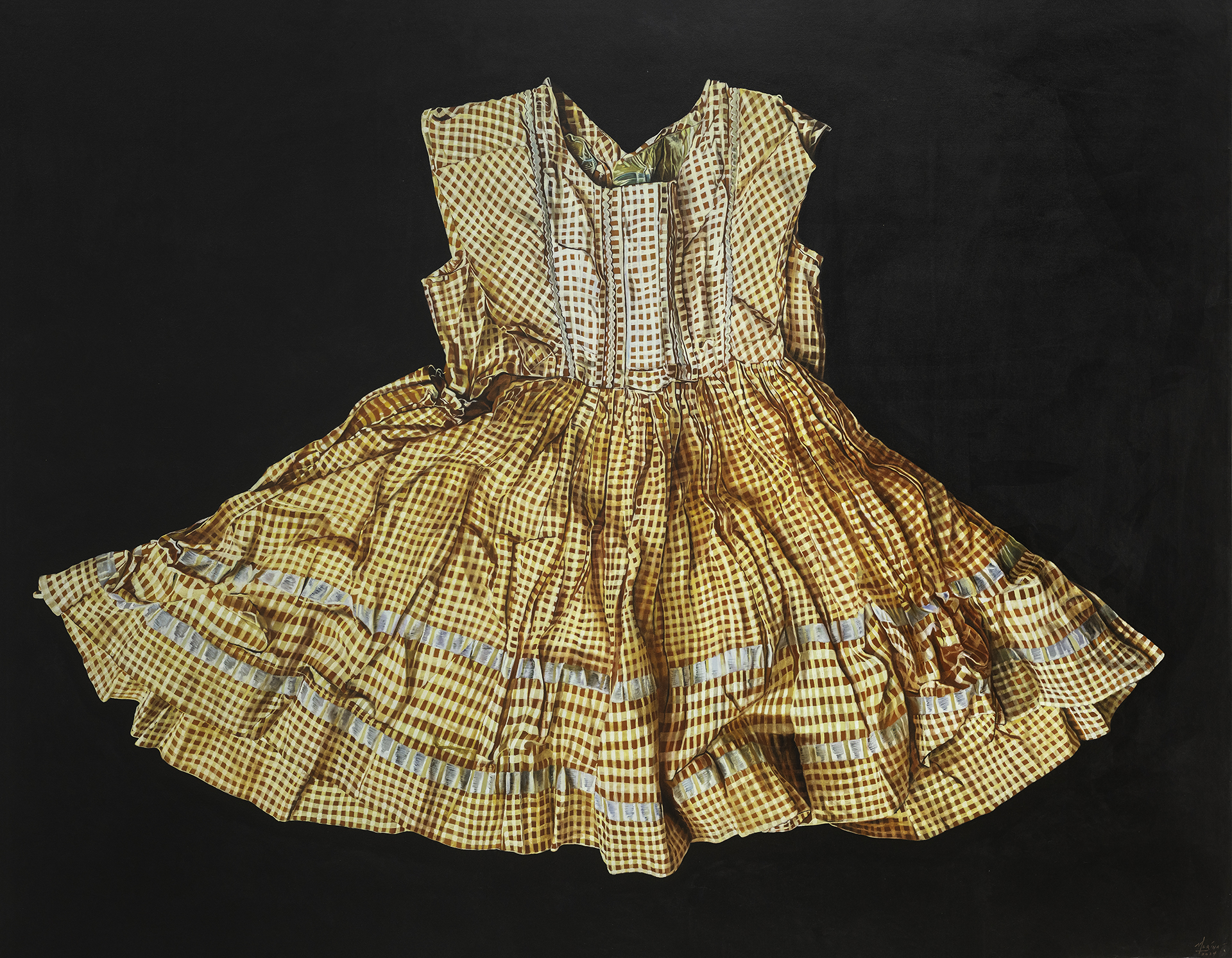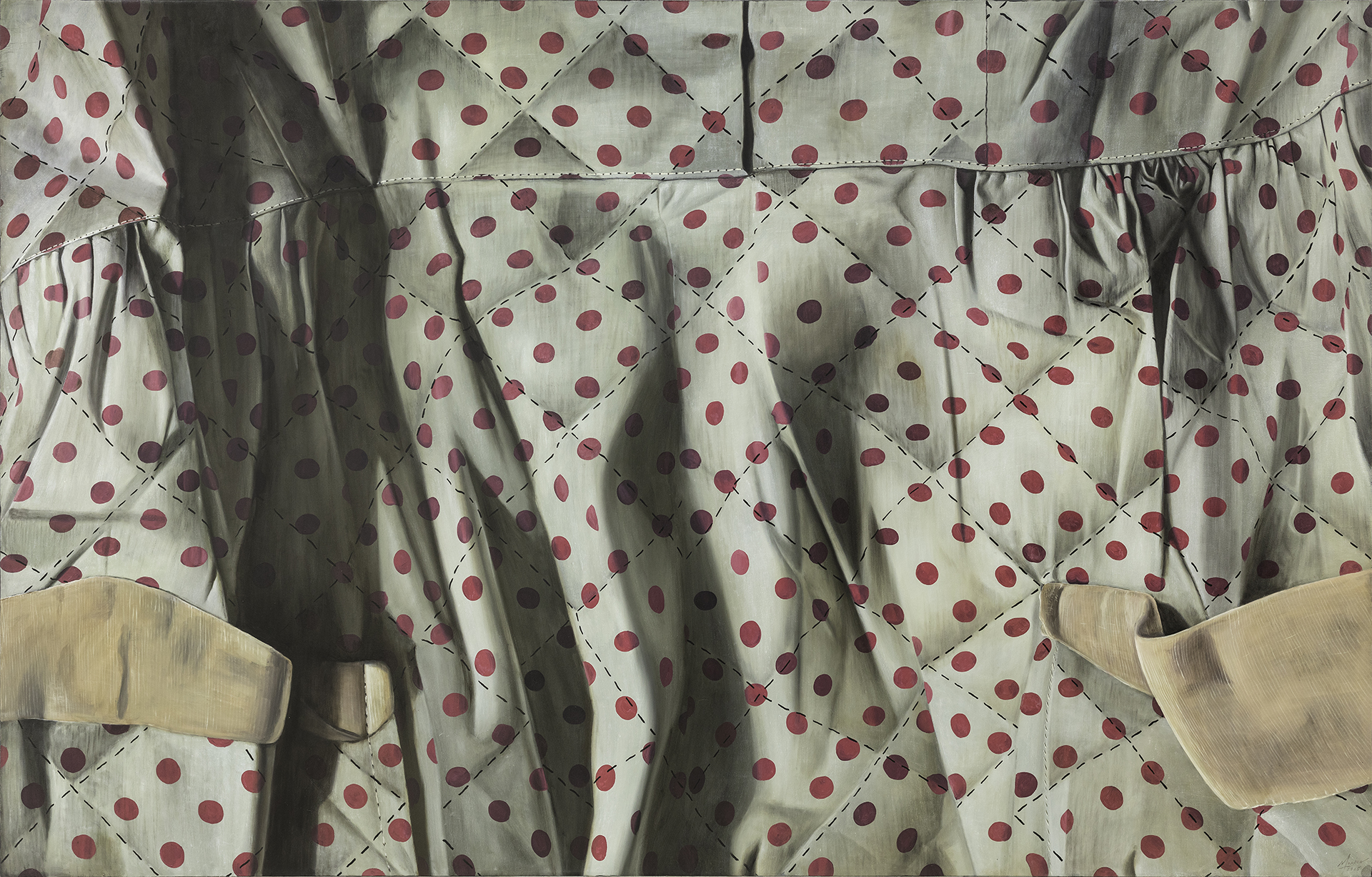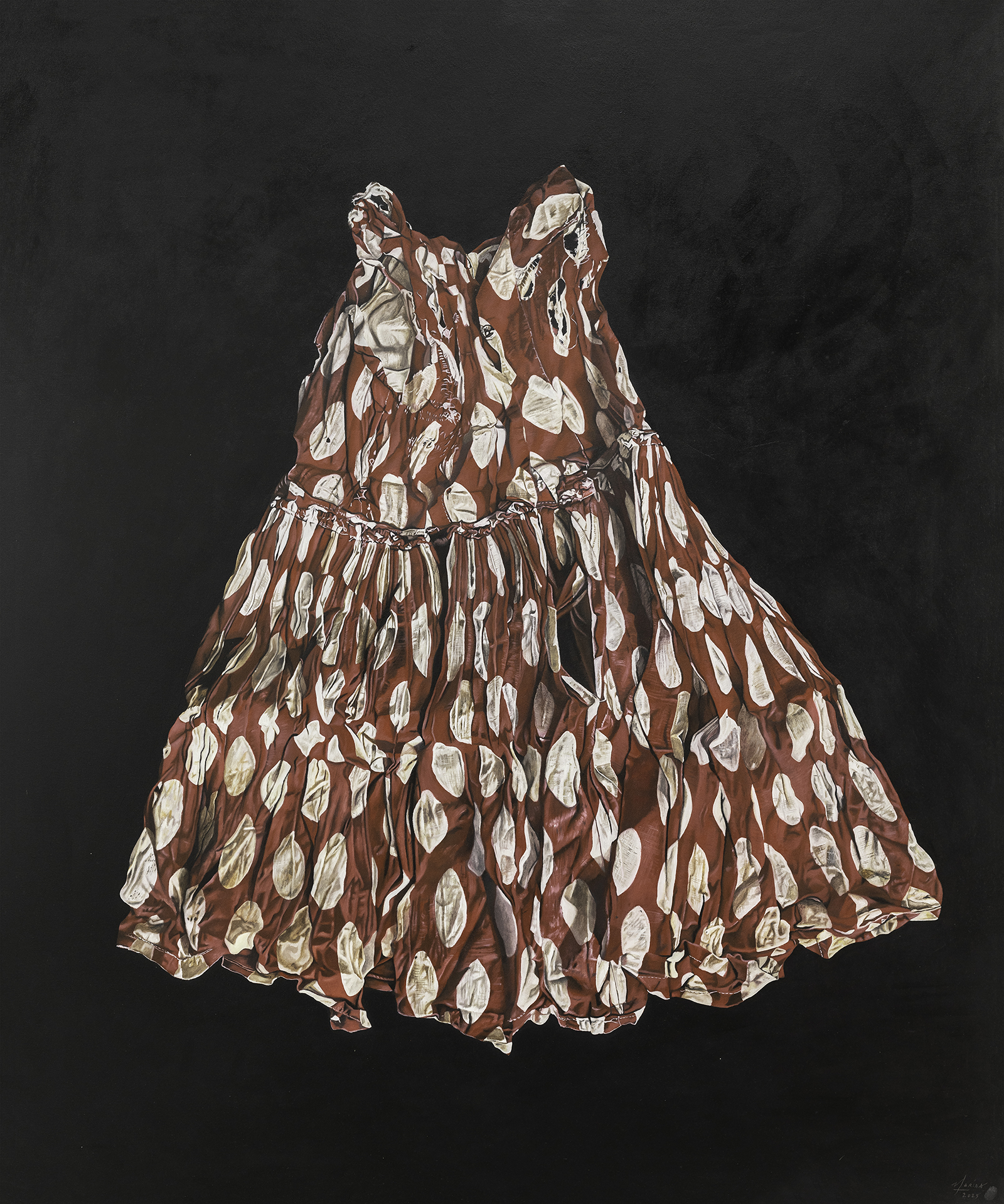 One painting in the show features a young girl’s red dress, suspended in a stark black field. It is one of only two paintings in the show that captures a piece of clothing in its entirety. The dress is filled with white polka dots — a pattern that repeats among the other weathered clothes in the show, echoing a faded innocence. The painting, entitled Tender, feels fragile, almost painful. The dress’ holes and loose threads remind viewers of the bodies that once ran and played in these clothes, perhaps learning how it felt to fall and wound themselves.
