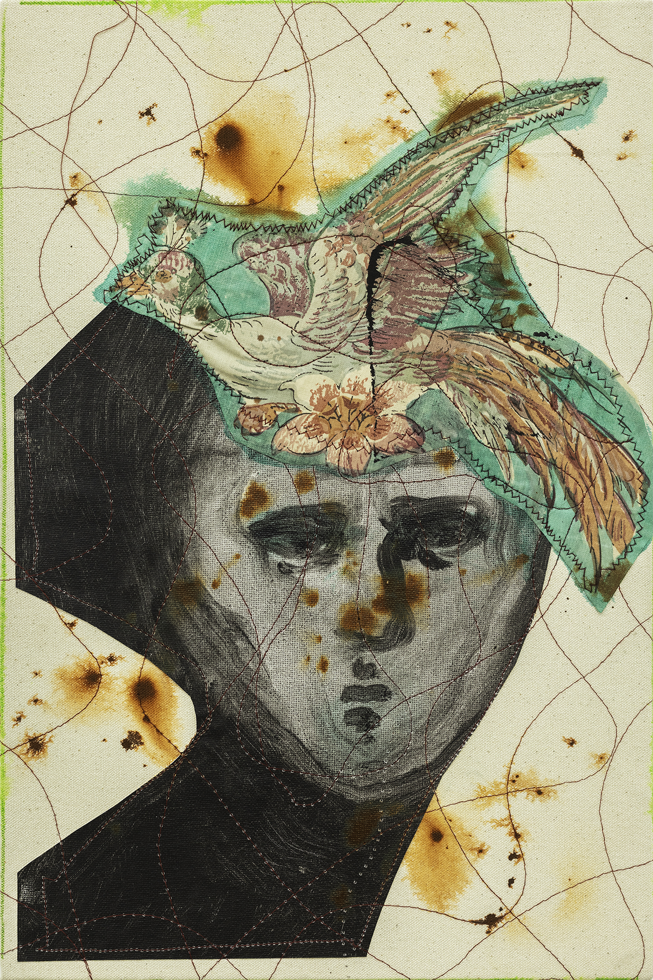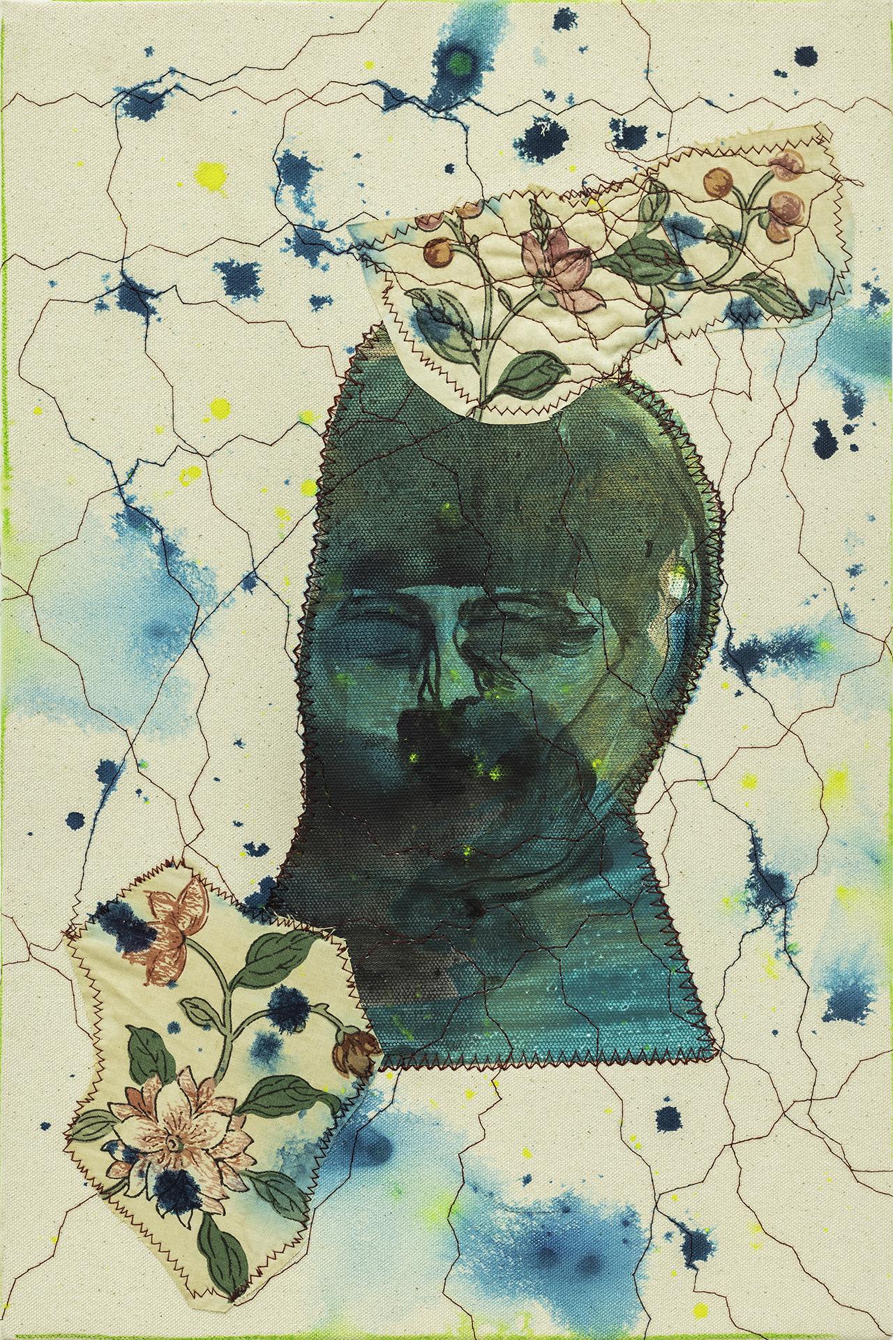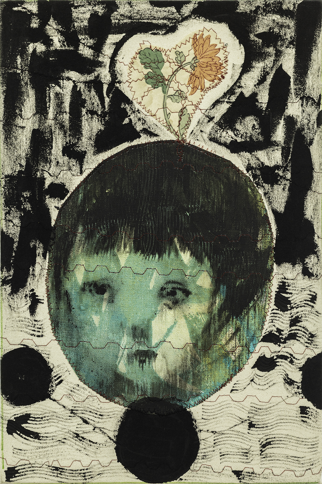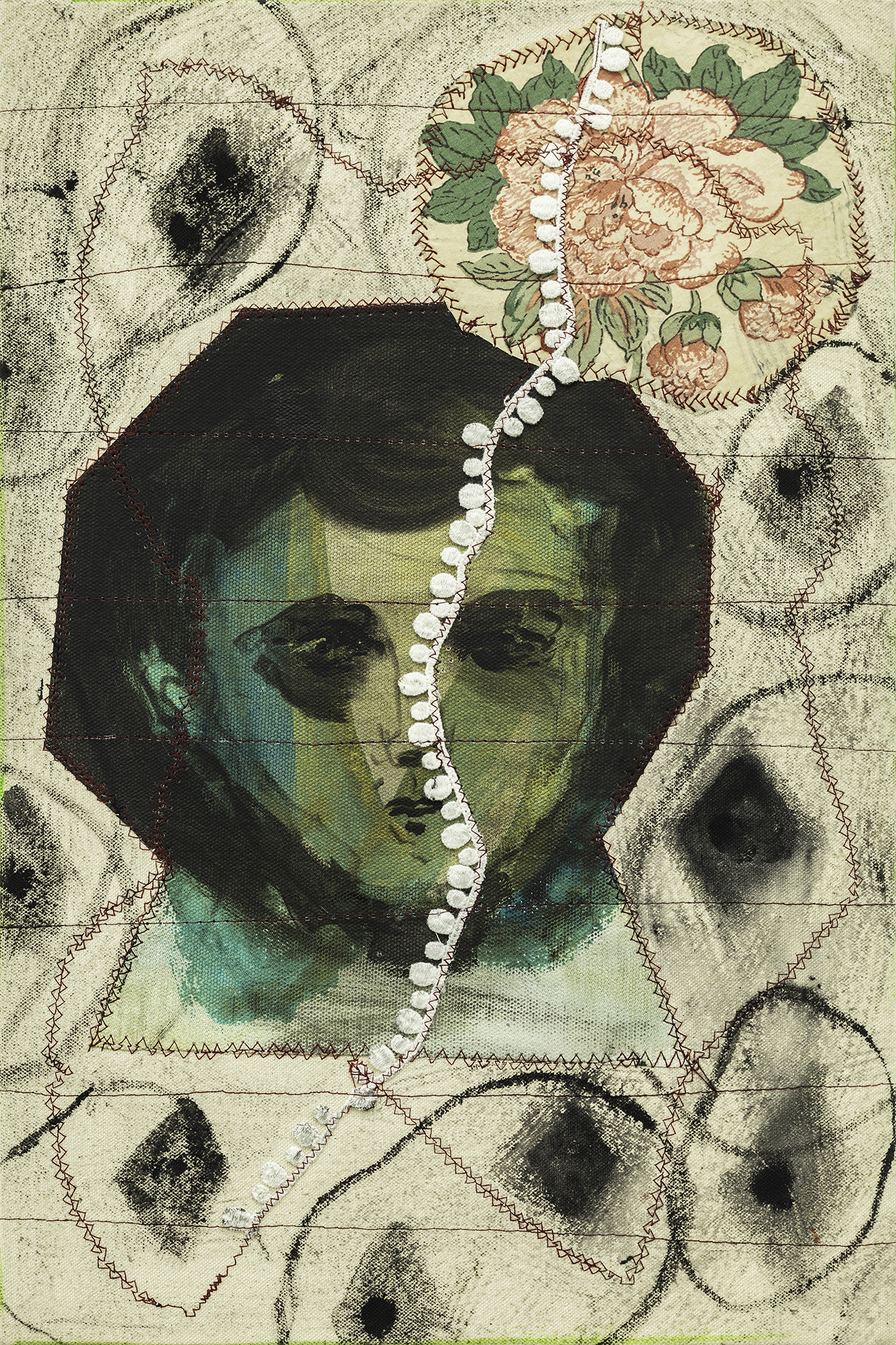 The show also offers a glimpse into Cruz’s experimental process. In a series of collages, she stitched scraps of the garments onto canvases where she left splotches, rough strokes and organic patterns. Cruz describes these works as her “warm-ups” — small canvases where she lets herself loose and musters up the motivation to create. Crude horizontal lines recur in some of the works, alluding to the pad paper that she once used in elementary school. Though the works originated from a sense of childlike play, their results are more complex. Hazy portraits emerge at the center of each canvas; according to the artist, they are not specific people. They appear like figments of dreams, their obscurity contrasting the reality of the fabric scraps. In one piece, two floral scraps and a face belong inside one dark circle, as if part of one organism.