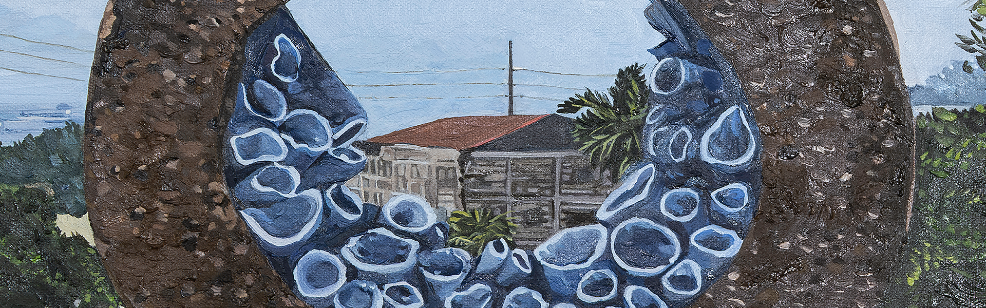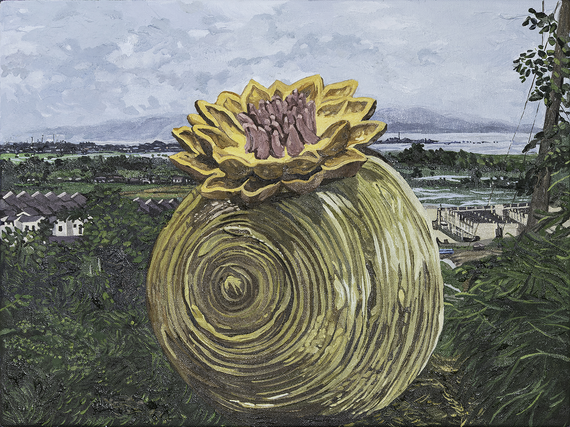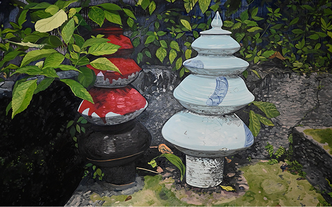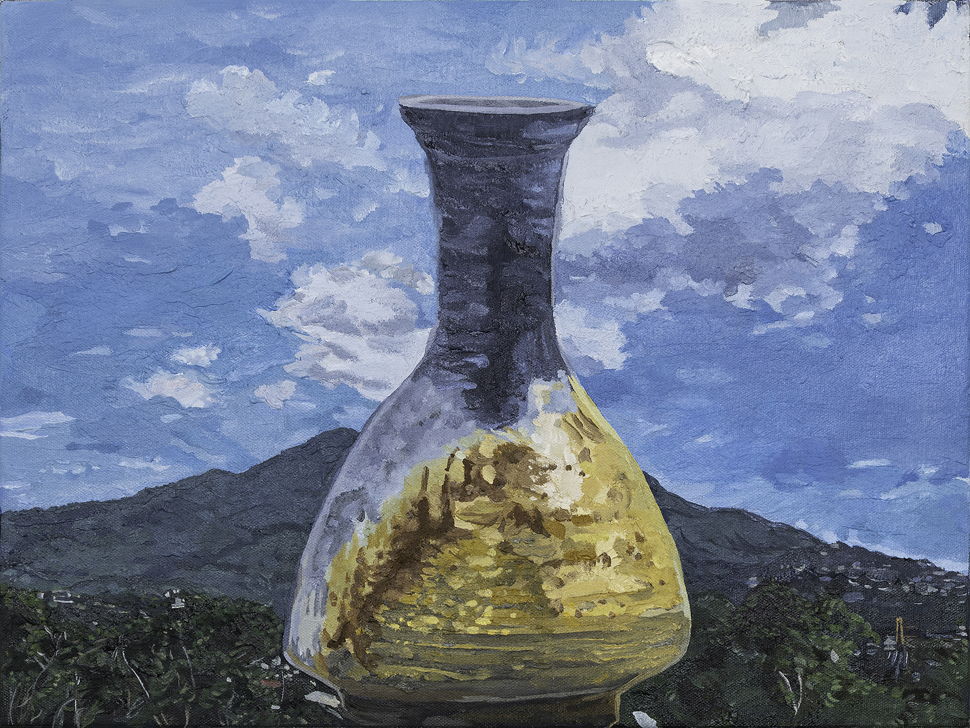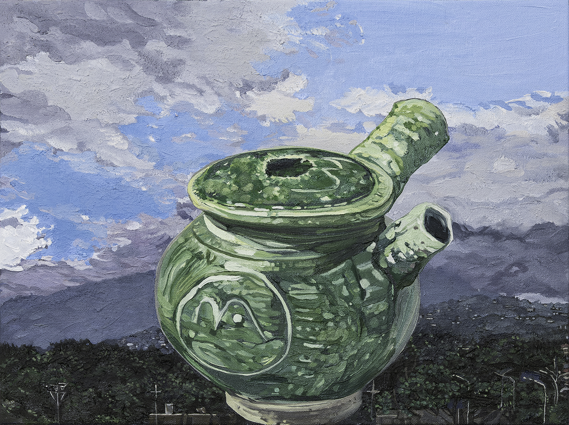 This body of work departs from Reflections, in Situ (2025), where she “zoomed in” on her father’s ceramics, letting surrounding foliage overtake them. In A Mountain’s Hands, she “zooms out.” Now front and center, her parents’ humble ceramics tower above mountain peaks and reach from lush undergrowth past treelines to clouded horizons. Sari-sari (sundry) stores, residential subdivisions, warehouses, and other urban encroachments shrink to the margins. This inversion of scale – between the handheld and intimate and the sprawling and expansive – exalts the ceramics, in the artist’s words, to a “grand, imposing, and heroic” status.