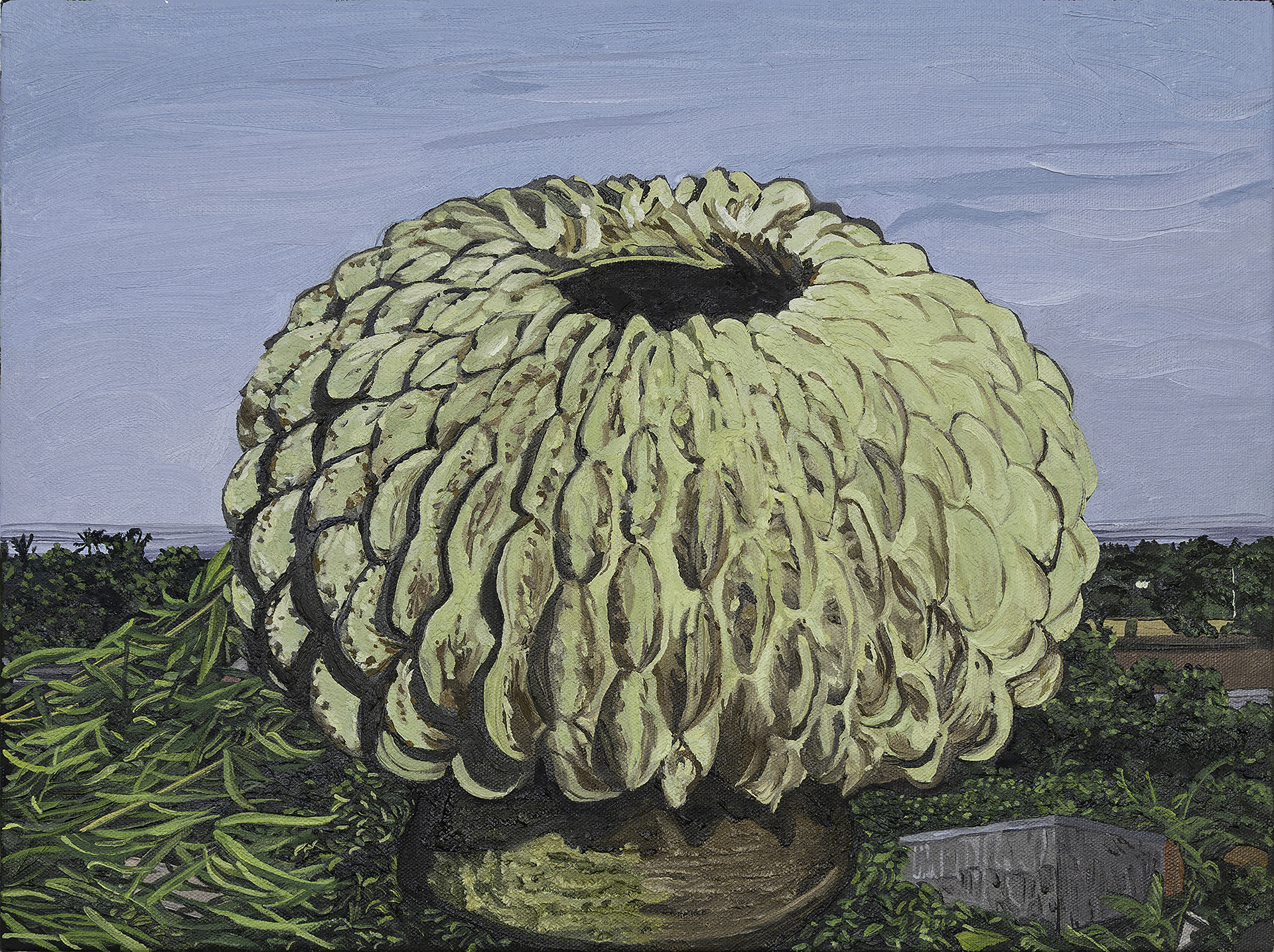 “I’ve had this fantasy of documenting all of my parents’ works, which is impossible now – they’ve been prolific since the ’70s – all the while aware of the irony that their ceramics will definitely outlive my paintings.” Leaning into that paradox of material (im)permanence versus the stability of representation, Pettyjohn renders her parents’ floral-topped, fringed, and fluted vessels on an intimate painter’s scale yet enlarges them against the panorama of Laguna’s countryside.