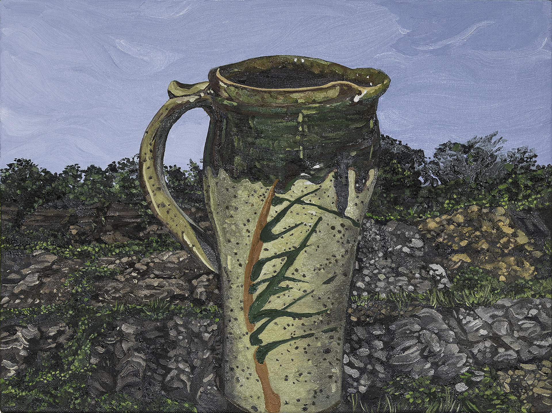 “I want to regard what the mountain gave us,” she reflects. Mount Makiling, in this sense, is not simply a lifeless place or insensate geological formation; it is animate and giving. Its elegant peaks and valleys have long been said to resemble the resting silhouette of Maria Makiling – Dayang Masalanta – a protective spirit, or diwata, sent by the creator Bathala to offer a celestial hand in the everyday toil of its people. In a similar play of mortal and divine, Pettyjohn paints her parents' ceramics as portraits. She reveres clay, form, vegetation, and industry – and their synchrony – melding them into a realm of the ordinary sublime.