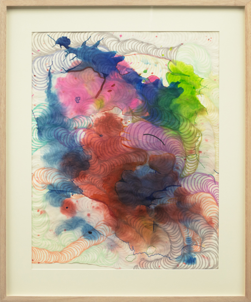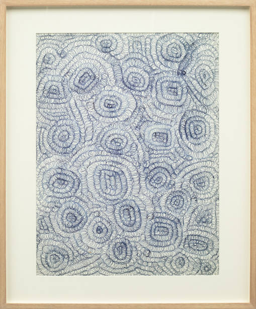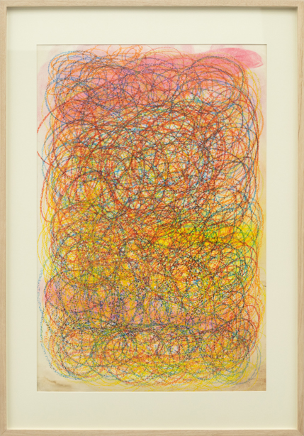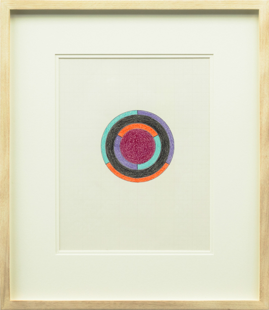 Meanwhile, Villa’s most recognizable motif, the coiling “slinky” form, appears throughout the drawings in looping technicolor lines. What first looks like a simple spiral becomes a charged ribbon of energy, ancestry, and motion. The form rolls through nearly every of his major works of the 1970s, his most iconic decade. It shows up in his seminal Tat2 self-portraits, his ceremonial capes, and his mixed-media paintings as a personal glyph. In the ballpoint drawings and rare centripetal compositions, the line tightens, graphic and precise, unexpectedly echoing Valledor’s discipline.