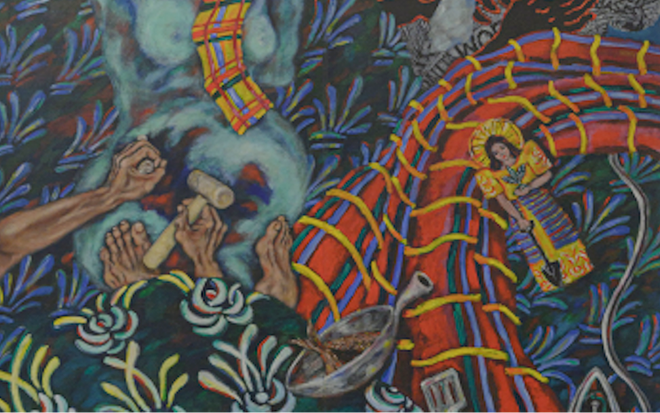 Kahapon Muli Bukas situates Filipina DH alongside Endaya’s more recent mixed media works, which tackle issues ranging from the struggle against religious oppression to the catastrophic effects of climate change in the Philippines. Here, women across the country’s vast history take center stage: a precolonial priestess, a transwoman, a grandmother. Endaya refuses their erasure from grand narratives. These women act. They labor. They fight. They guide. They exorcise. They heal. They hope. The migrant domestic workers of Filipina DH stand on the shoulders of these women. Collapsing centuries in one space, Endaya moves us to close the distance between ourselves and the neglected Filipino women of yesterday, today, and tomorrow.