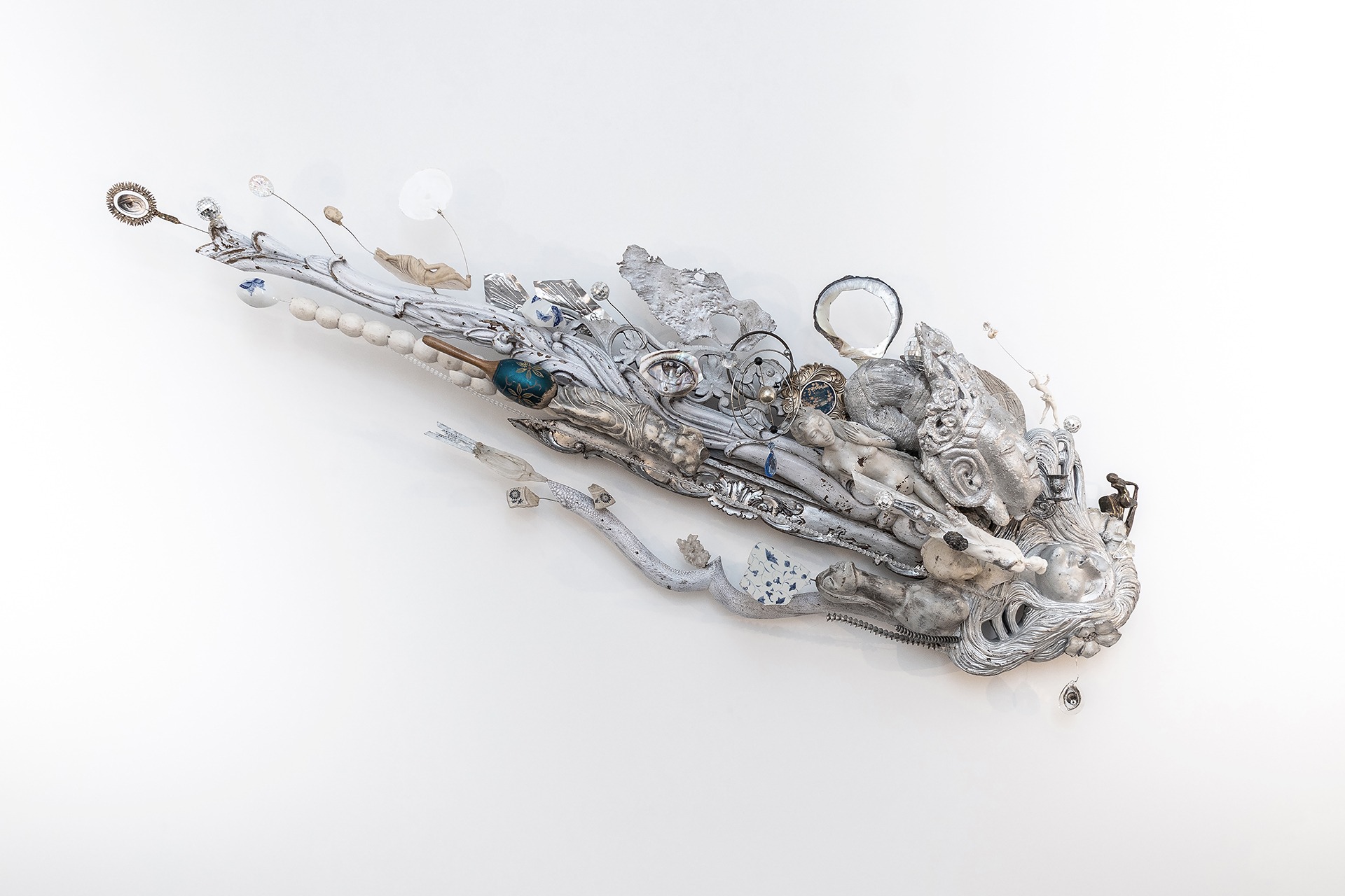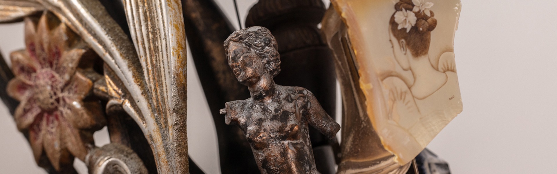 Made largely from objects sourced in thrift stores, Japanese surplus shops, and the antique markets of Bangkal, long known as a destination for collectors and bargain hunters, Halili breaks these objects down into pieces before reconfiguring them into new compositions. He emphasizes that his approach remains fundamentally painterly: adding a piece, stepping back, observing, and deciding what might enter the composition next. Built slowly over the course of months, the works are, at their core, assemblages and perhaps owe more to Joseph Cornell than to Bernini, even if the fragments themselves are taken from busts, wings, and drapery of decorative reproductions of classical sculpture.
