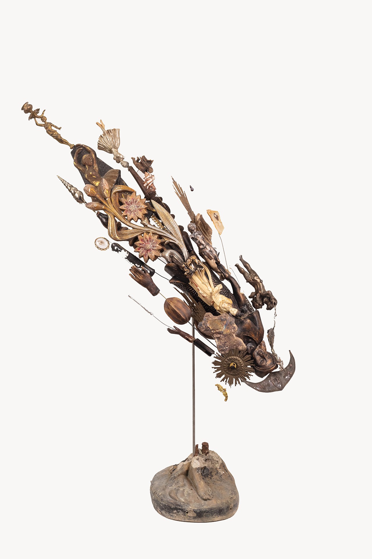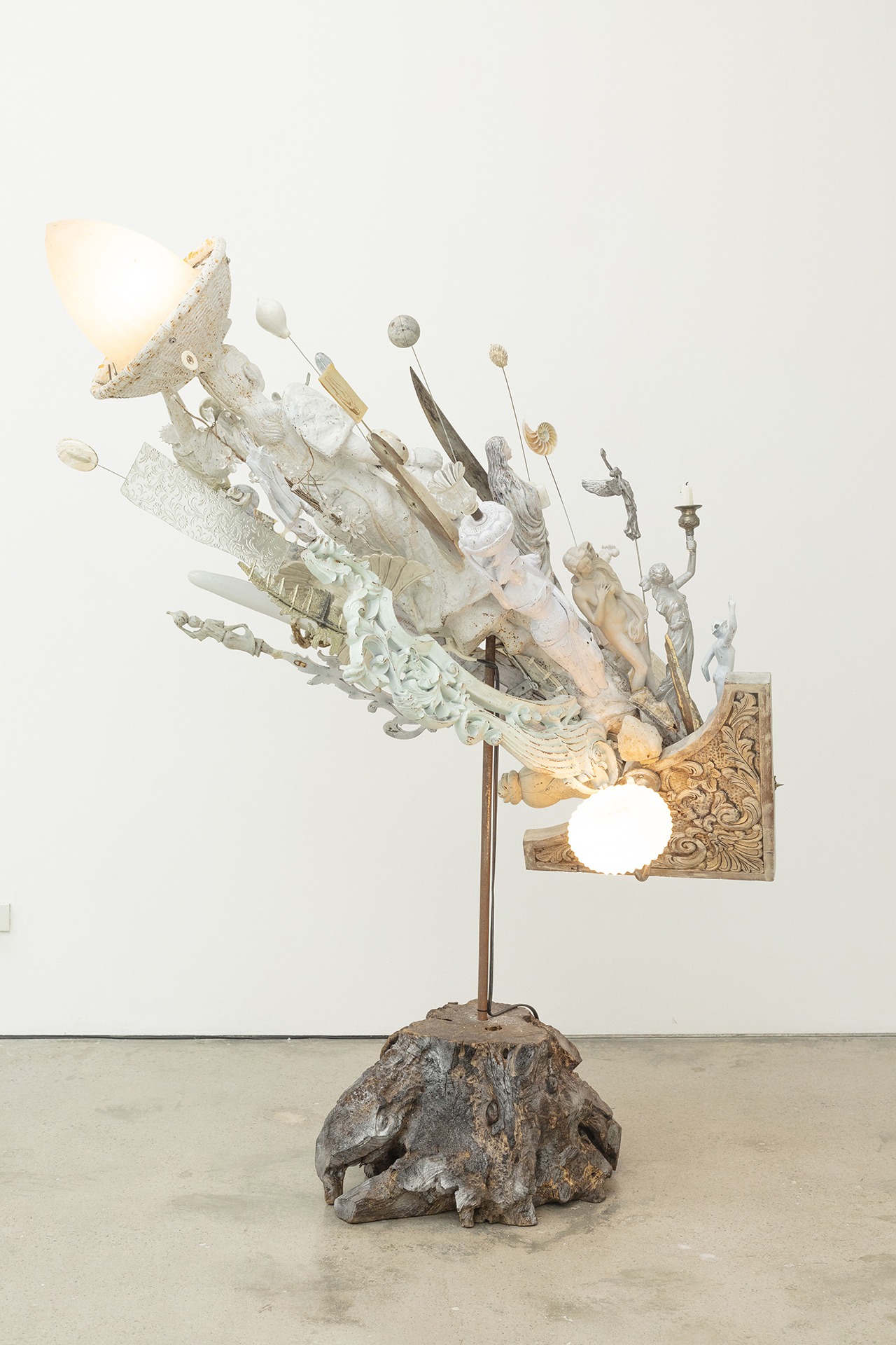 The first series of comet sculptures was shown at Silverlens (Manila) in 2022, in Halili’s solo exhibition Heavenly Bodies. For this initial set, he resisted the use of any practical light source. The new collection embraces the addition of light, placed thoughtfully within the entangled fragments, and only where it can intensify the sense of glowing heat and forward momentum. Here, Halili’s comets take on an ethereal quality, coming closer to the golden halos or resplandor found in religious iconography. Designed to imbue a radiant aura, these crowns or disks appear behind the head or body of a sacred figure, bathing it in divine light. In Halili’s hands, the gap between figure and illumination seemingly collapses, with torsos colliding with light fixtures, as if an altar or curio cabinet were sucked into orbit, shattered parts gaining velocity and propulsion, before slowly converging into a singular body.