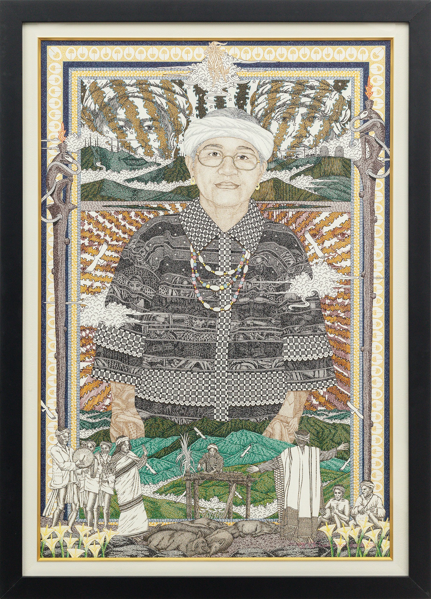 In his portraits, objects and scenes surround each of the subjects, building on the world where each operates. But the choice of elements also reveals Sabado’s learnings. He speaks of an artist who has introduced him to the medium of pen and ink, two Kalinga women leaders who have devoted their lives to sustaining Indigenous traditions, a mambunong who is a master in the Madmad ritual of the Ibaloi, an Indigenous impressionist artist who has for decades faithfully painted Ibaloi lifeways, and a mumbaki who taught him about Ifugao spirituality. Coming from his experience, Sabado implores the value of culture-bearers for the community’s youth.